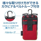 ストラップ付でショルダーポーチとしても使用可能。カラビナ&ベルト付きで腰に装着して持ち運びが可能。ショルダーハーネスに取り付け可能