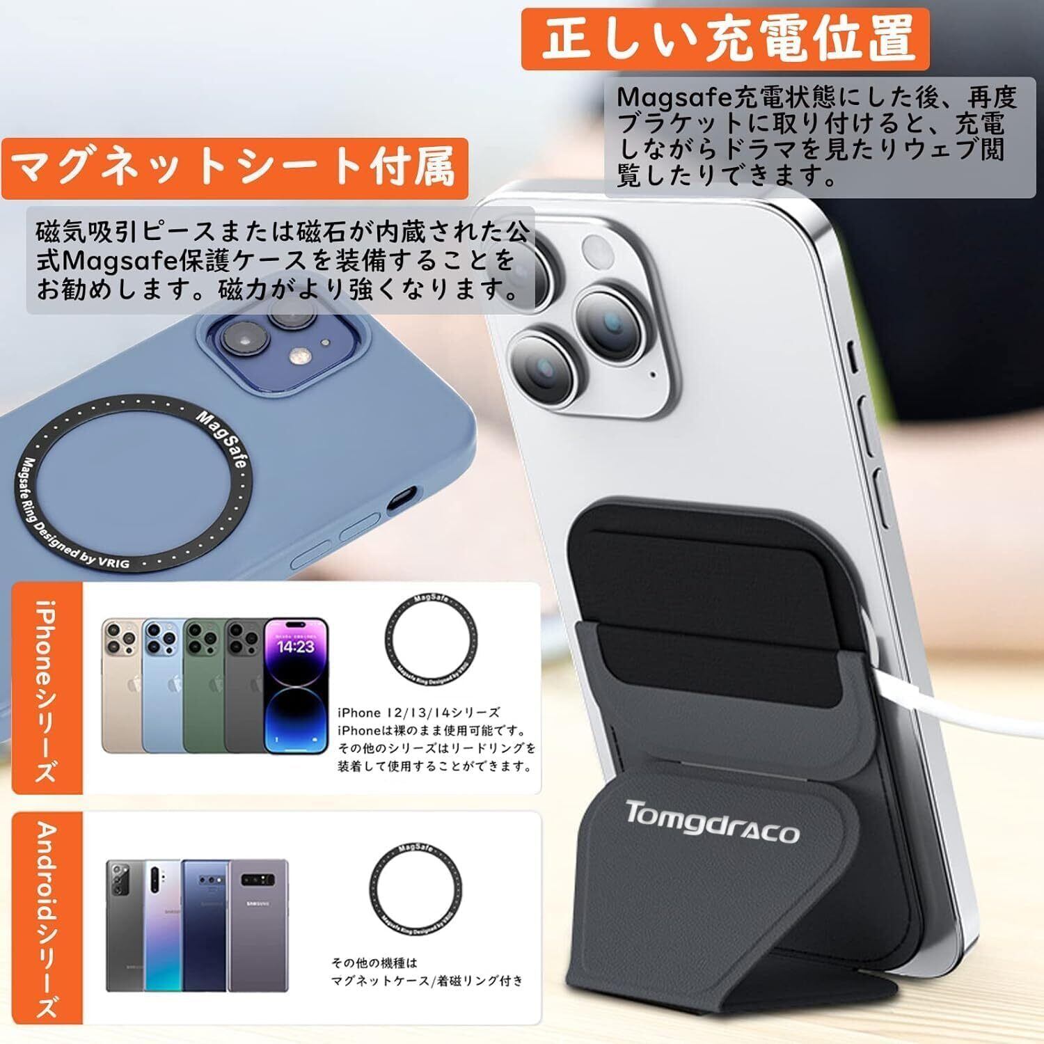 TOMGDRACO Magsafe対応 マグセーフ スマホスタンドiPhone 16/15/14/13/12 スマホ シリーズ対応 マグセーフカードケーススマホスタンド スマホケース 超薄 卓上 繰り返し可能 多角度調節 脱着簡単 落下防止 Androidスマホ/iPhone シリーズ用 iPhone mini非対応 iphoneアクセサリー (タイプ1)
