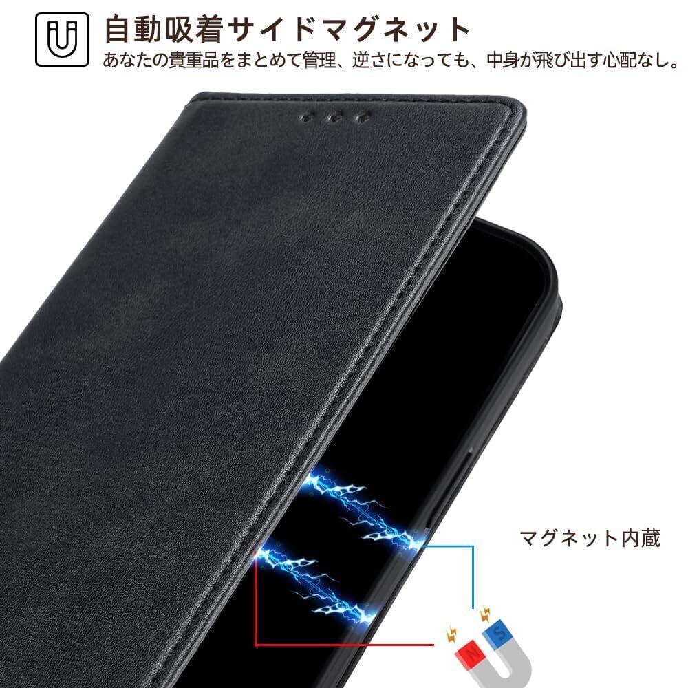 「スタンド機能&装着便利」レザーカバーの内面にソフトケースで装着簡単、素材には合皮レザーが使われており、おしゃれなデザインが特徴です。さらに、ケースを折って立たせることで、スマホスタンドとしても利用することができます。