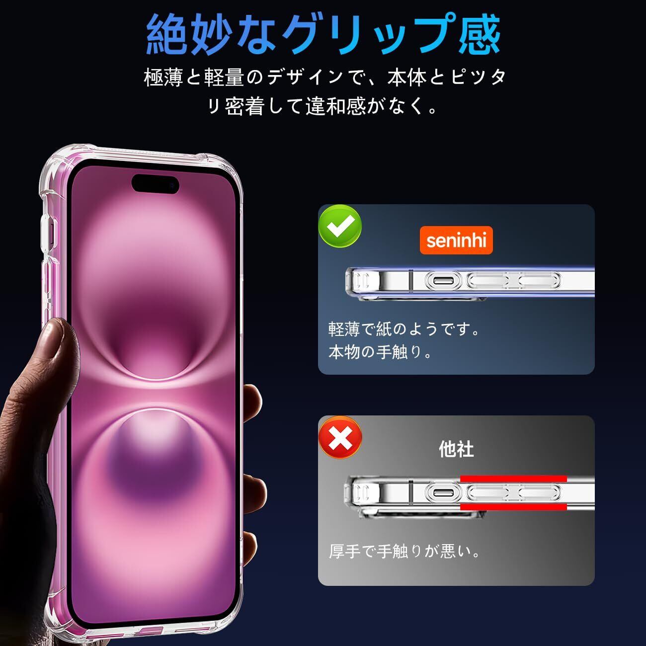 【360°フルガード 軍用グレード、高い耐衝撃性】 本製品はに対応する透明ケースです。外側のシェルは高い耐黄い耐性を備えた最先端技術ADMを採用しております。しかも環境にやさしく、無毒で無味の高品質の素材を使用して、酸化防止処理しており、長年でも黄色くなりません。多数回のテストした後、2mの高さで様々な角度から26回落としましたが、携帯電話が全然傷がありませんでした!更に四隅の耐衝撃性は通常の携帯電話ケースの5倍に達し、携帯電話を全面的に保護できます。(ご注意:ご購入前機種をよくご確認くださいね。間違った機種の購入による使えないことを避けてください)
