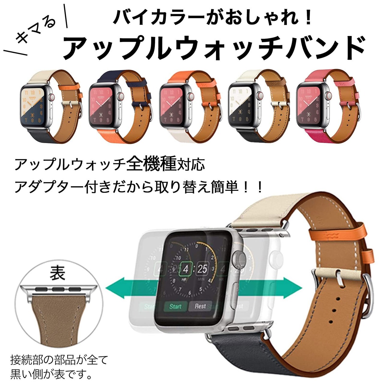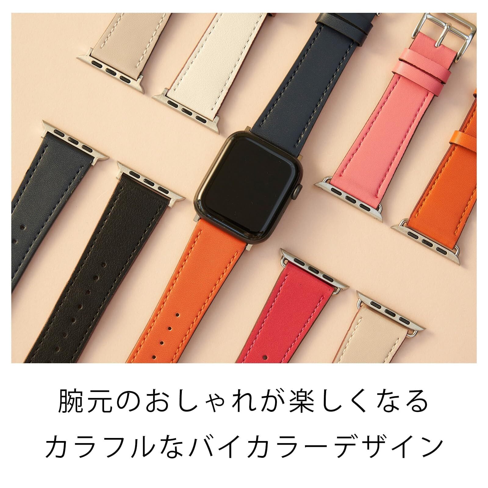 デザイン:エルメスデザインを意識した高級感溢れる質感と素材を採用。バイカラーを使用することで腕元の存在感をアップさせてくれる大人のアップルウォッチレザーバンドです