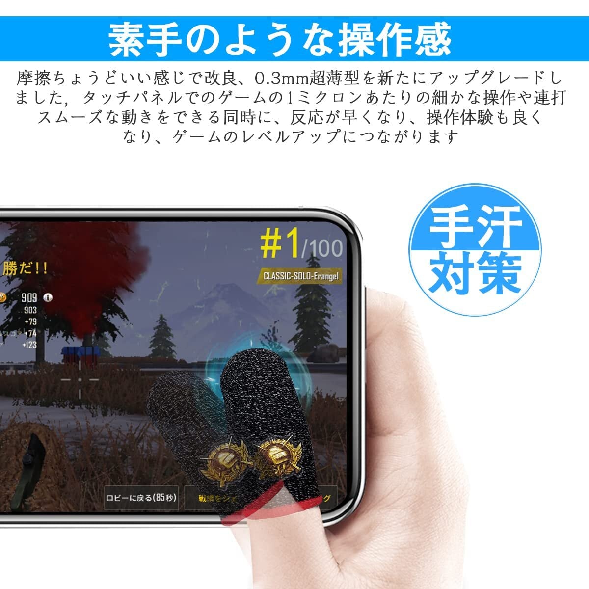 【技術革新・超薄銀繊維 指サック】24番手の糸で高密度に織ったためのゲーム用指サック、1平方センチメートルあたりの導電ポイントが240箇所もあります。抵抗も摩擦抵抗値も低く、汗を吸収しやすく、通気性にも優れ、長時間利用頂いても、高い感度と優れたストレッチ性を保つことができます。また、従来品の13や18番手の指サックより耐引裂性と耐摩耗性があり、ゲーム中に簡単に壊れることを減少できます