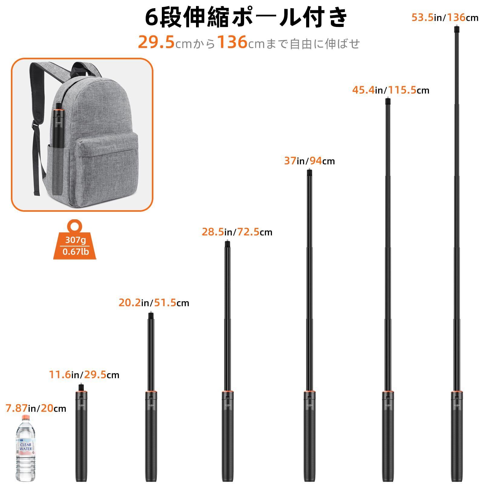 調節可能&コンパクトセルカ棒: 6段階の伸縮式ポールで 最大伸長136 cm、収納時29.5 cm。重量わずか307グラム、バックパック収納可能で旅行やアウトドアに最適。