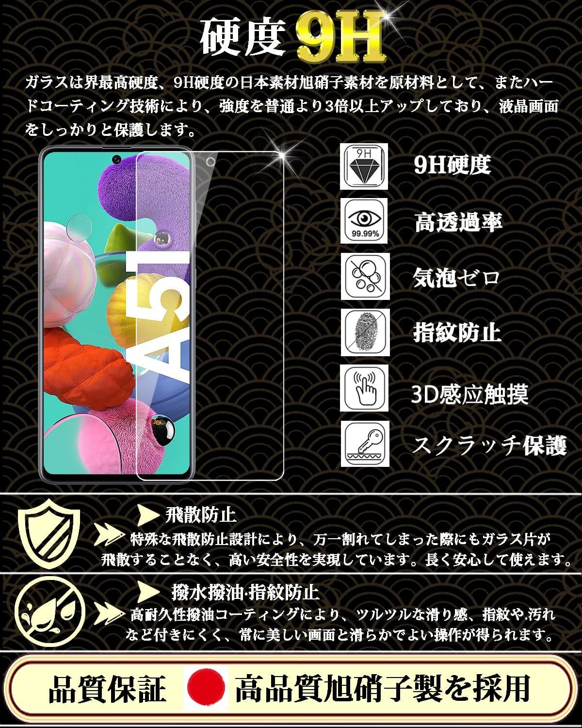 【日本製素材旭硝子製】Galaxy A51 / SC-54A / SCG07 ガラスフィルムは日本製の旭硝子を素材として採用し、業界最高レベルの9H硬度を持ち、耐衝撃性と耐傷性に優れています。衝撃吸収の特性により、転落とかの外力からスマホ画面への衝撃ダメージを最小限に抑えることができます。