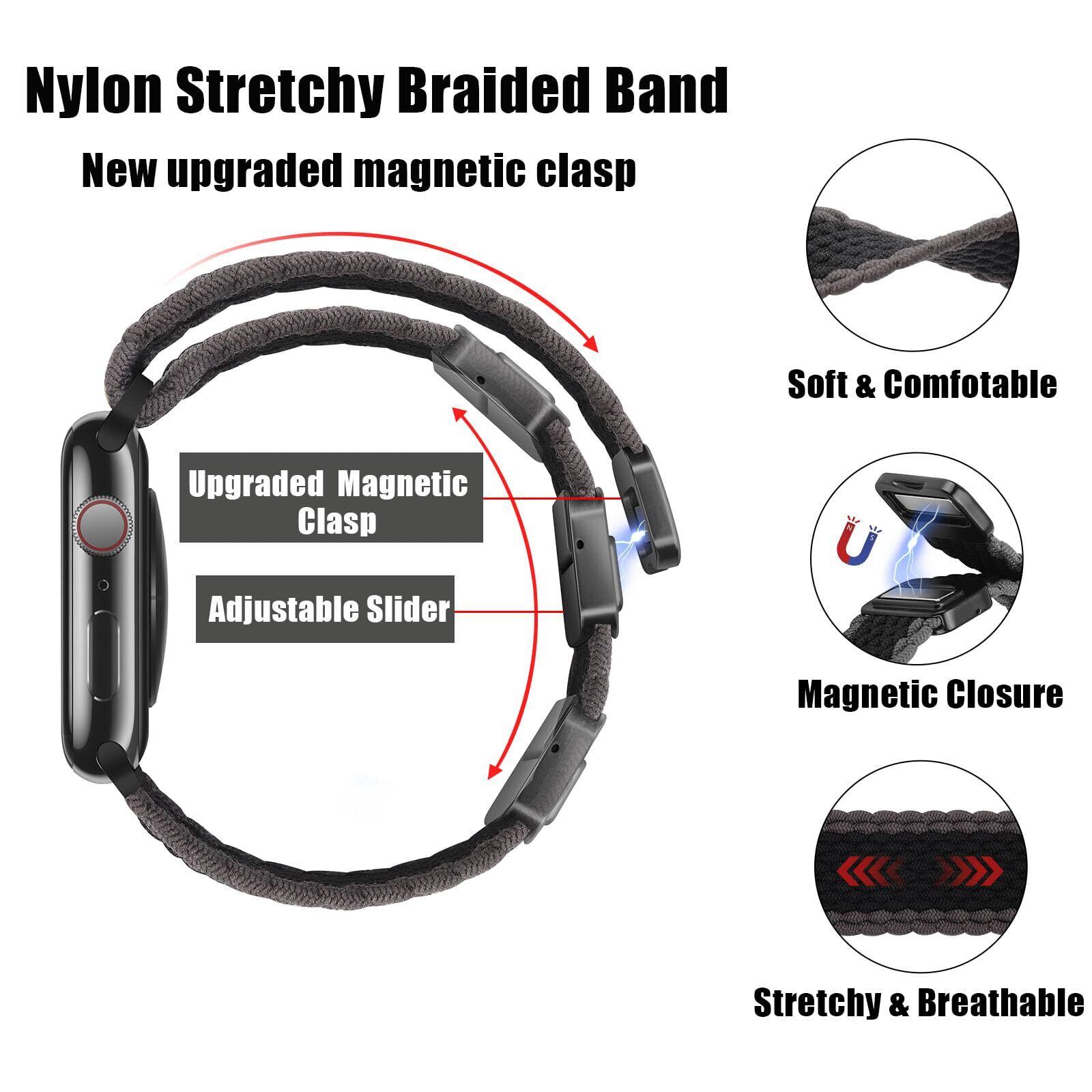 [HITZEE] Band コンパチブル Apple Watch バンド 49/46/45/44/42/41/40/38mm、磁気留め金付きのナイロン弾性編組バンド調節可能なスポーツアップルウォッチバンド付き Apple Watch Ultra 2 Ultraシリーズ 10 9 8 7 SE 6 5 4 3 2 1 に対応(42/44/45/46/49mm,ブラックグレー)