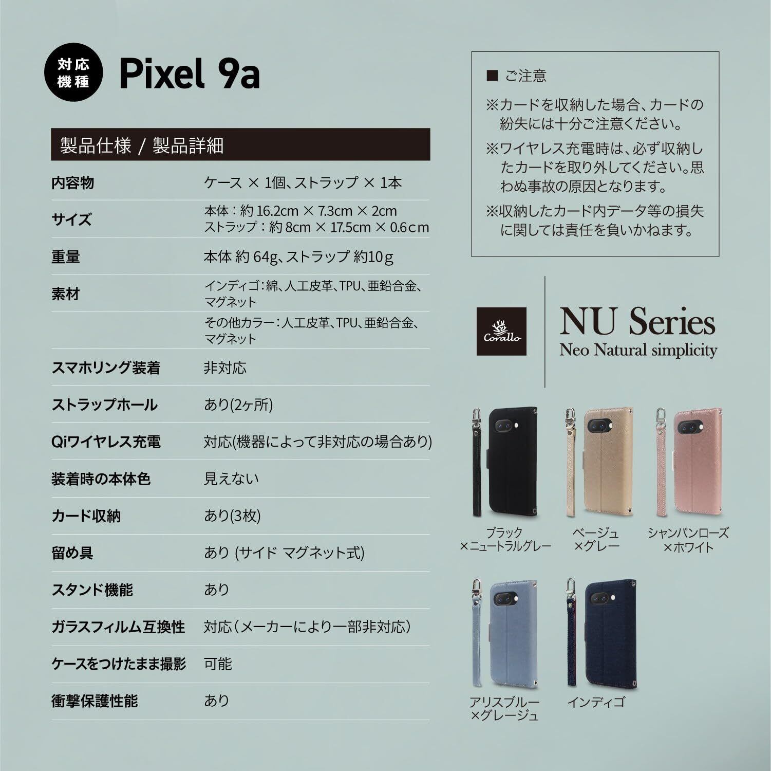 【製品仕様】… ◆ 対応機種 : Pixel 9a ( グーグル ピクセル 9a ) ◆ 内容物 : ケース × 1個、ストラップ × 1本 ◆ サイズ : 約 16.2cm × 7.3cm × 2cm ◆ 重量 : 約 74g ◆ 素材 : インディゴ:綿、人工皮革、TPU、亜鉛合金、マグネット その他カラー:人工皮革、TPU、亜鉛合金、マグネット