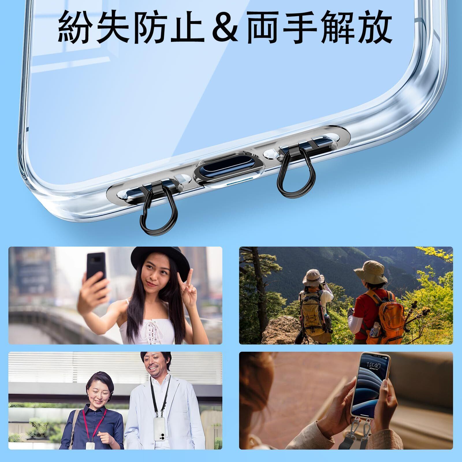 【装着簡単・充電に影響なし】携帯電話本体(底)とケースの間に挟んで使用します。充電ポートをふさがない設計のため、充電中でもご使用いただけます。スマホを落とさないための必需品です。ストラップと組み合わせて使えば、スマホの落下・紛失を防ぎ、両手を解放する利便性をお楽しみいただけます。自撮りや散歩、通勤、旅行など日常生活でスマホを落とす恐れなく片手で操作が可能になります。