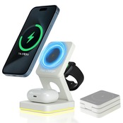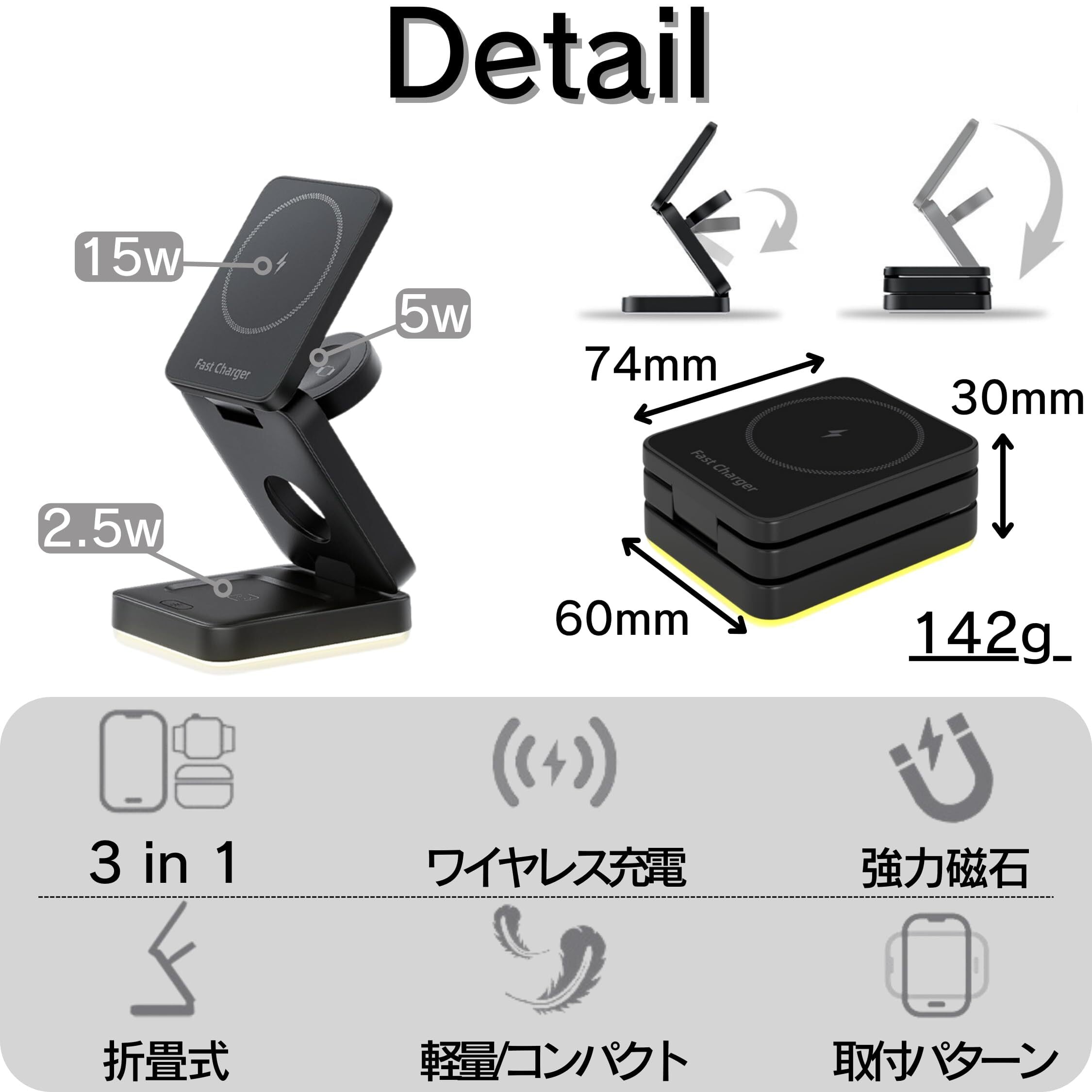 iPhone、AirPods、Apple Watchを同時に充電できる、MagSafe対応の3in1ワイヤレス充電器です。強力なマグネットでデバイスを固定し、最大15Wの高速充電を実現。デスク周りをスッキリと整理し、あなたの毎日をよりスマートにします。 【主な特長】 3台同時充電 iPhone、AirPods、Apple Watchを同時に充電可能。充電時間を短縮し、時間を有効活用できます。 【MagSafe対応】 強力なマグネットでピタッと吸着。ズレを防ぎ、安定した充電を実現します。 【コンパクト設計】 折りたたみ式で、持ち運びにも便利。出張や旅行先でもスマートに充電できます。