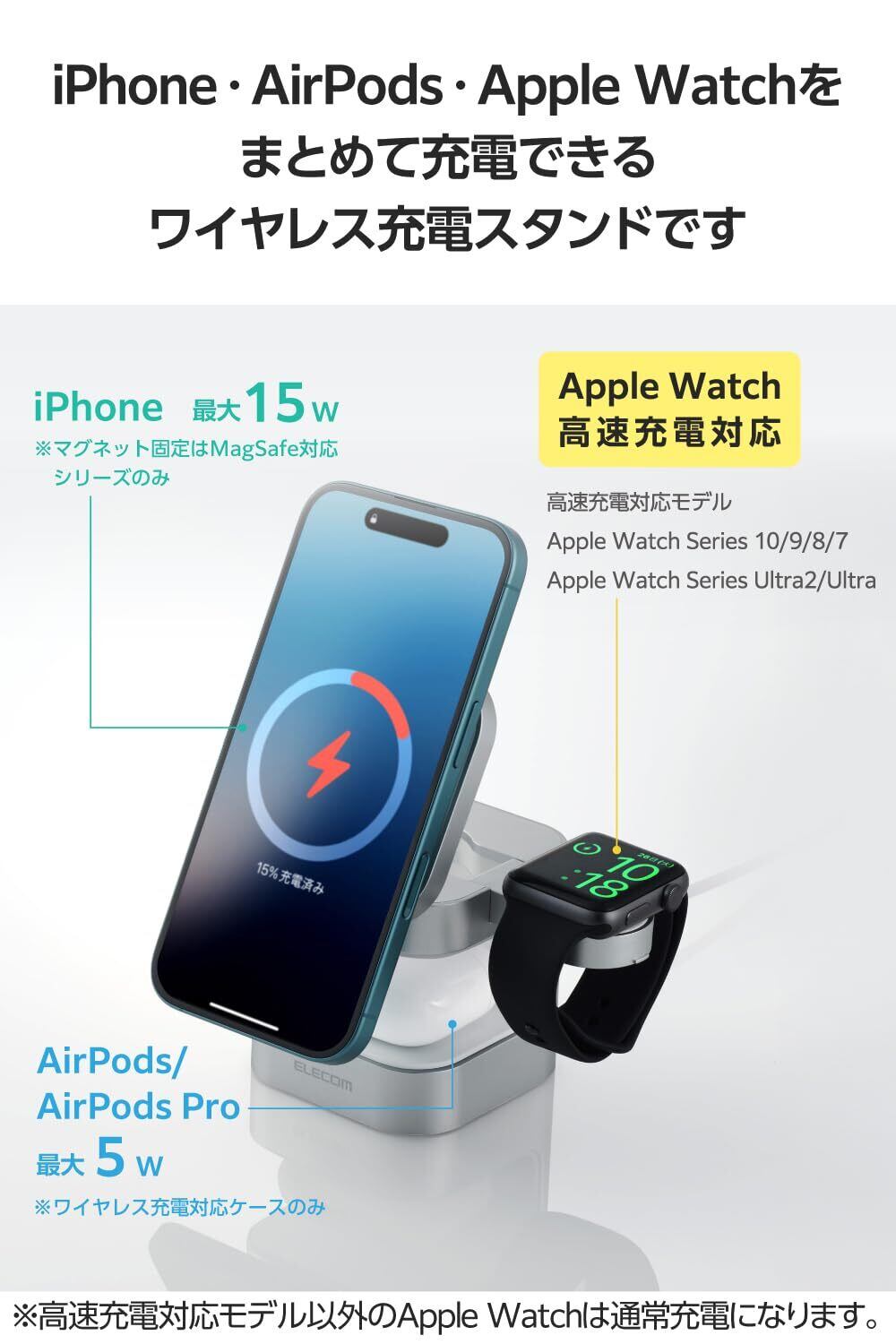 ■対応機種:スタンド部:Qi2(MPP)15W規格のワイヤレス充電に対応した機器、AirPods向けQi部:ワイヤレス充電に対応したAirPodsシリーズ(2024年10月現在)、Apple Watch充電部:Apple Watchシリーズ