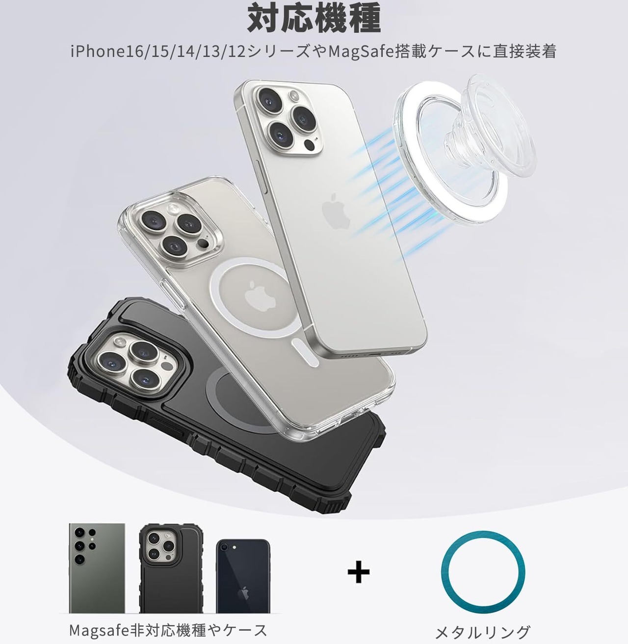 【幅広い互換性】①[MagSafe専用]iPhone 16 シリーズ、iPhone 15 シリーズ、iPhone 14 シリーズ、iPhone 13 シリーズ、iPhone 12 シリーズ本体、MagSafeケースと直接に使用できです。②[金属リング付属]MagSafe非対応スマートフォンと通常携帯ケースは付属金属リングが後ろに貼るだけでも利用できます。