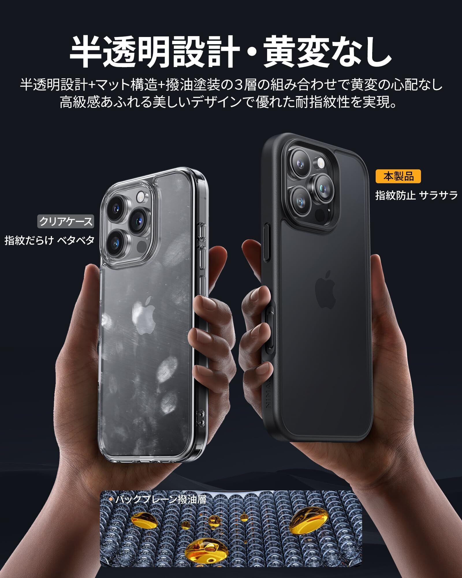NIMASO iPhone16ProMax用 ケース カバー 滑り止め マット仕上げ 全面保護 いPhone16ProMax対応 耐衝撃 米軍MIL規格取得 ワイヤレス充電 ストラップホール付き アイフォン16プロマックス対応 (6.9インチ) スマホケース ブラック (黒羽シリーズ)NSC24I1521