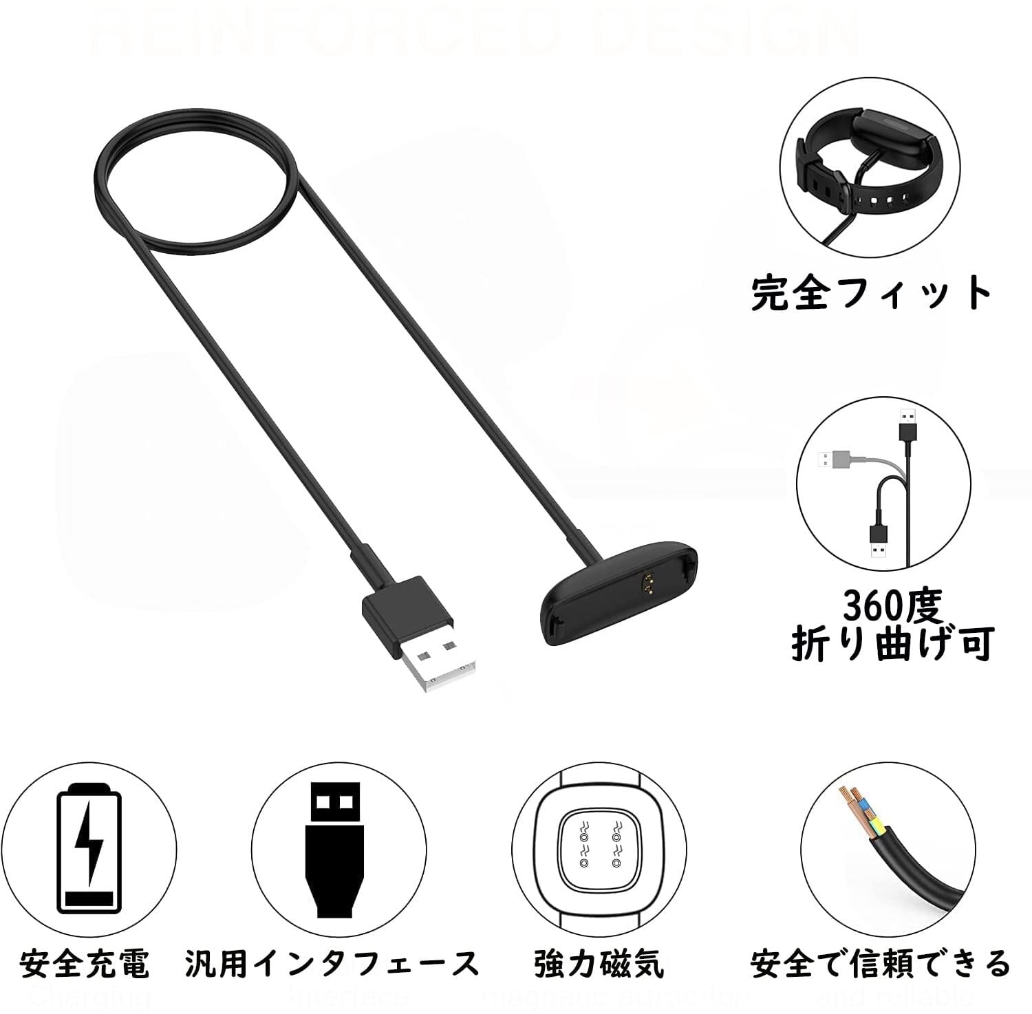フィットビット 充電ケーブル 100㎝ Fitbit inspire2 / Fitbit ace3 充電器 スマートウォッチ チャージングケーブル 急速充電 磁気吸着 ブラック