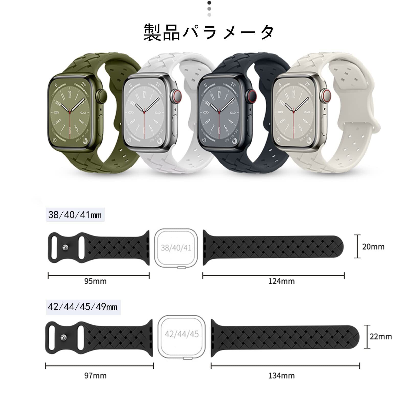 【対応機種】iWatch 41mm / 40mm / 38mm対応。バンドの表面に数個の調整穴があり、長さが自由に調整可能です。手首サイズは150-200mmの方に適します。購入前に、お手首の周りを測定してください。(Watch本体は付属しておりません、バンドのみです)