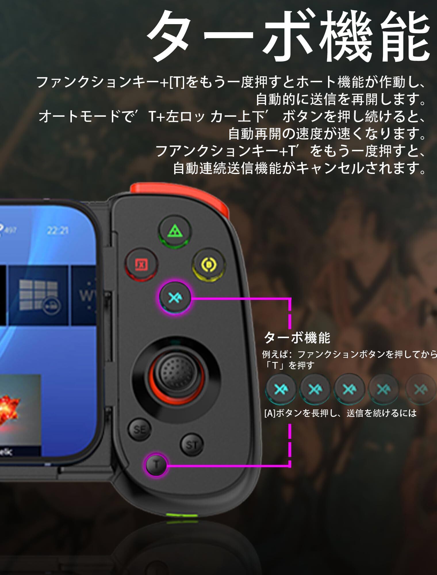 【3段階ターボ機能】iphone ゲームパッドはターボブースト機能を搭載し、ゲームによって、マニュアルモード、オートモード、キャンセルモードの3つのターボブーストモードを調整できます。A/ B/ X/ Y/ LT/LB/RT/RB/ 十字キーをターボブースト機能に設定でき、シューティングゲームや格闘ゲームで勝ちやすくなります。