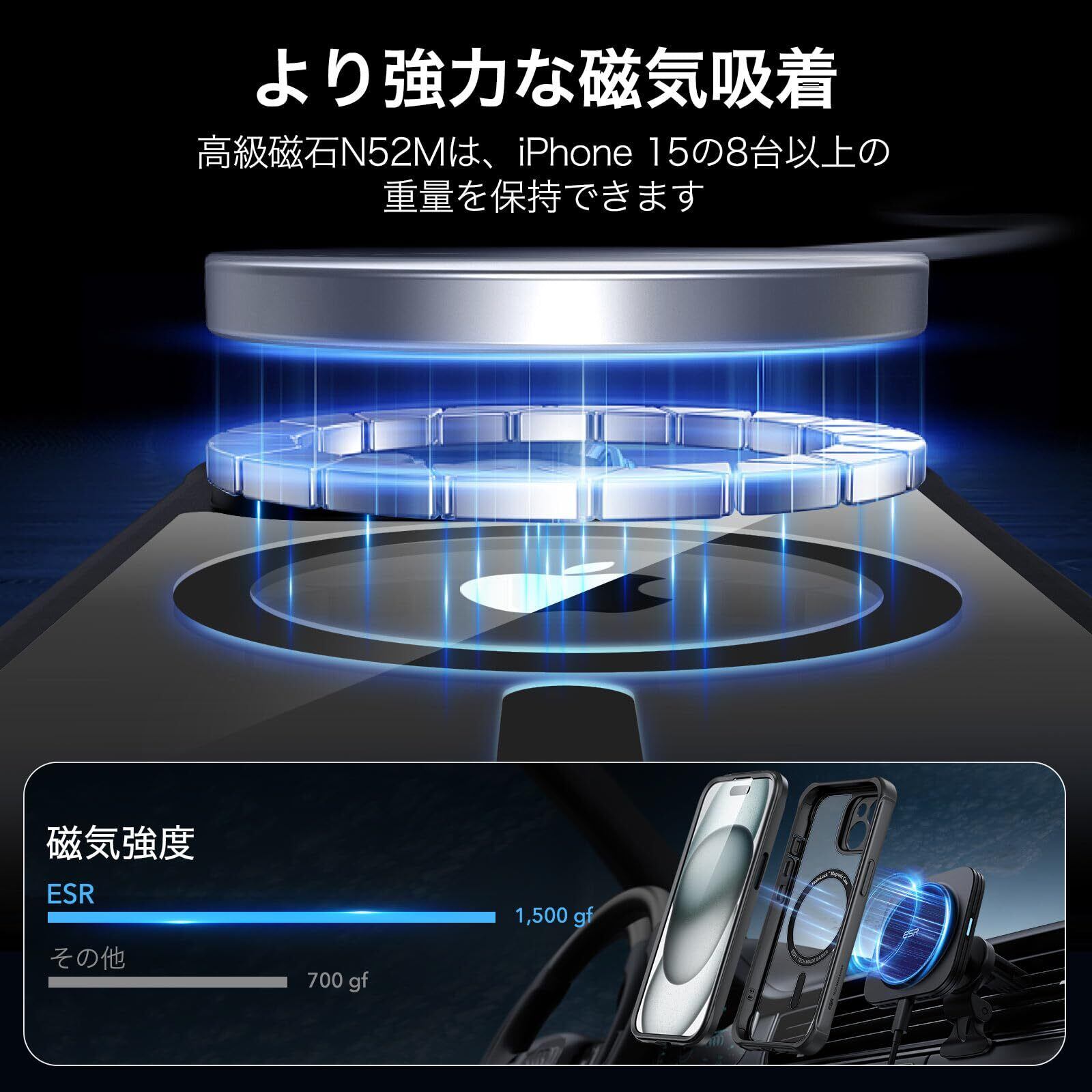 【より強力なマグネットロック】1,500gの保持力を持つ強力な内蔵マグネットが、より速く、より便利な瞬間吸着ワイヤレス充電および、あらゆるMagSafeアクセサリーへの確実な磁気吸着を可能にします。