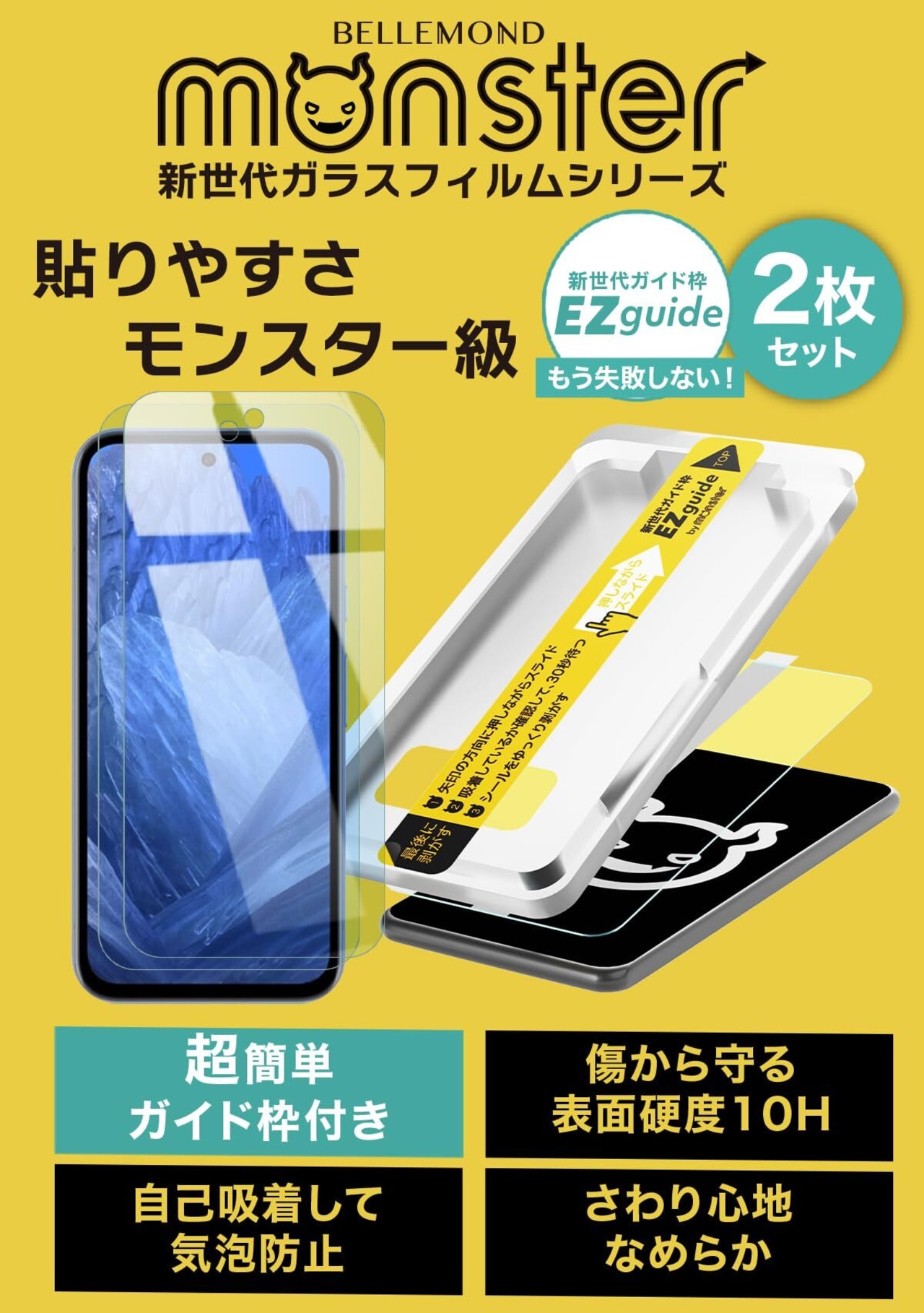 モンスターフィルム Google Pixel 8a 用 | 強化 ガラスフィルム ブルーライトカット 保護 フィルム 硬度10H | グーグル ピクセル8 ベルモンド ガイド枠付き 2枚 セット B1551