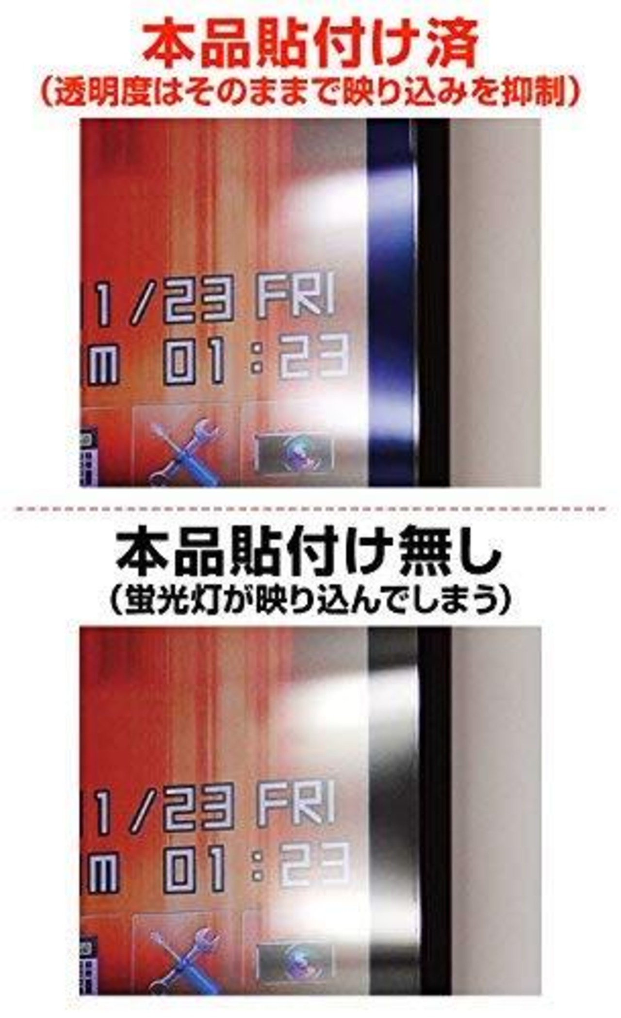 【映り込み抑制&高光沢(クリアタイプ)】透過率92.4%と透明度が高いことに加え、蛍光灯などの映り込みを貼り付け前に比べ約4分の1に抑える(最小反射率1.1%)光沢フィルム(グレアフィルム)です。 映り込みを抑えつつも液晶画面がクリアかつ鮮やかに映るので、動画や写真の閲覧に最適です。