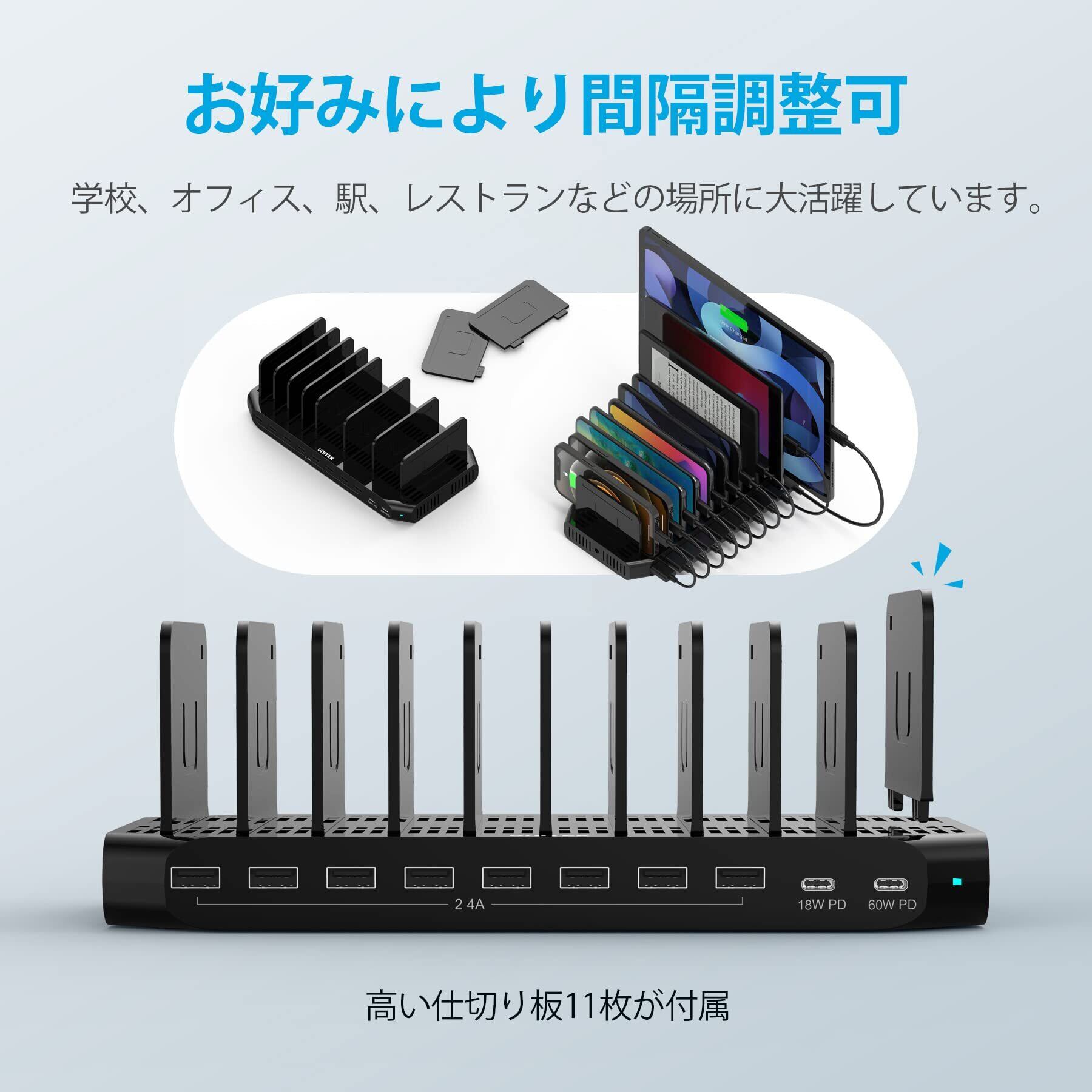 Unitek 2023 USB充電ステーション 10ポート PD18W PD60W 卓上充電スタンド 120W PSE認証済 10台同時充電 1.5A/2.4A/3A スマートIC搭載 複数台対応 Android/iPhone/iPad/kindle/タブレット/PSP 仕切り板 間隔調整可能 収納便利 卓上 黒