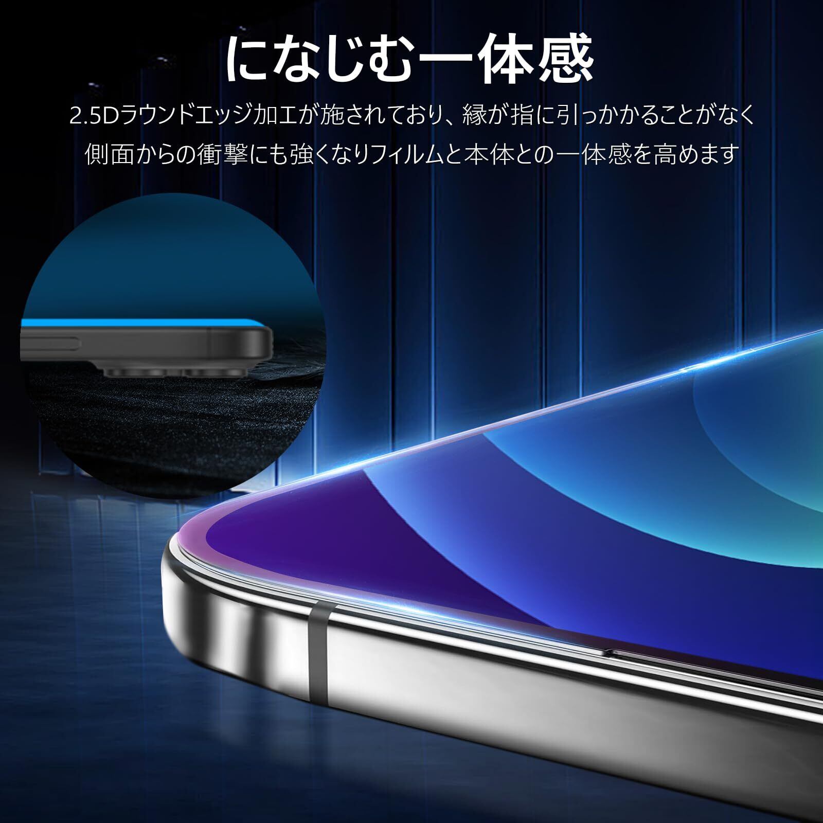 【ガイド枠付き・貼付け簡単】 ガイド枠をはめる→上側に合わせて、フィルムを置く→軽く押すだけで自然に吸着。フィルム貼りことが苦手の方でも簡単に貼る事が可能です。また、縁にラウンドエッジ加工が施されており、iPhone本体の縁に適度なスペースを残すデザインとなっており、12/12Pro 携帯フィルムの剥がれや浮き上がりを防止し、スマホケースと干渉せずに快適に使えます。