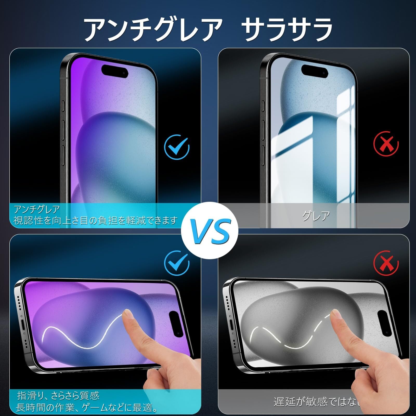 【アンチグレア・指紋防止・高感度タッチ】 アンチグレア(非光沢)タイプのさらさらで快適な操作感。光の反射を軽減し、より目に優しくちらつきを抑えます。同時に、いPhone 15 Plus フィルム には撥油コーティングが施されており、指紋が目立ちにくくなって、付着した汚れなどは簡単に拭きとれます。さらさら質感で指滑りもよく、長時間の作業、ゲームなどに最適。