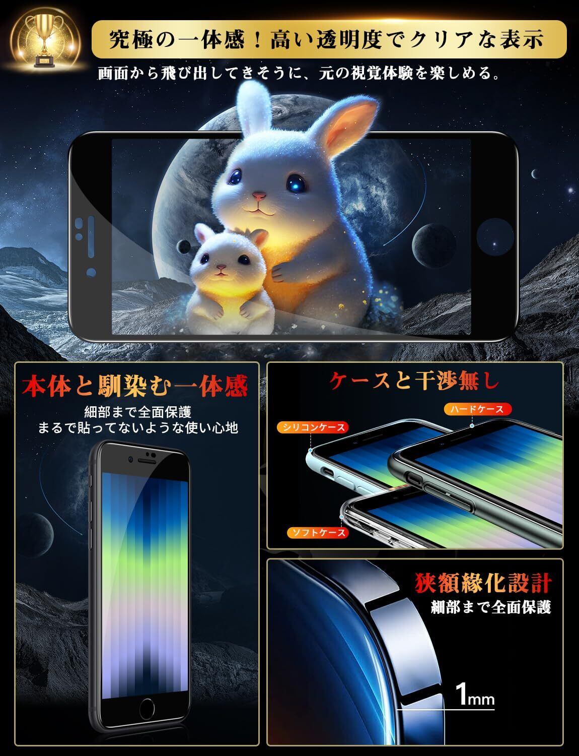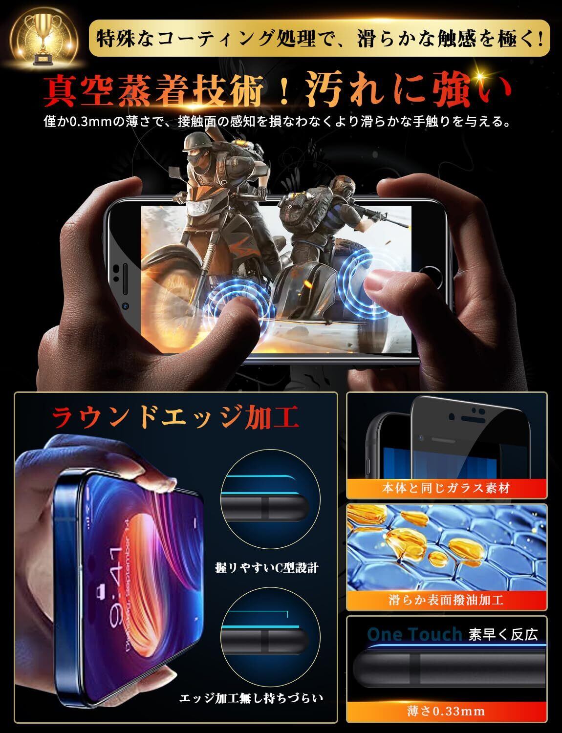 【全面保護!圧倒的な耐衝撃性・最高硬度9H 】日本AGC社製の旭硝子を採用し、通常ガラスなどと比べ、強度、耐傷性、質感のすべてにおいて優れた性質を持ち。一般的なガラスに比べ約6倍の表面強度を持ち衝撃を緩和し、画面へのダメージを最小限まで抑え、すり傷などの細かい傷や、ベタつく指紋から画面をしっかりと保護します。【2024進化!浮き上がりなし】iPhone SE3・SE2の曲面エッジにより設計され、新熱曲率技術を処理し、iPhone SE3/SE2/8/7兼用できます。曲面の縁によりラウンドエッジ加工を施され、さらなる技術革新によりエッジに浮き上がりないこともう実現できます。
