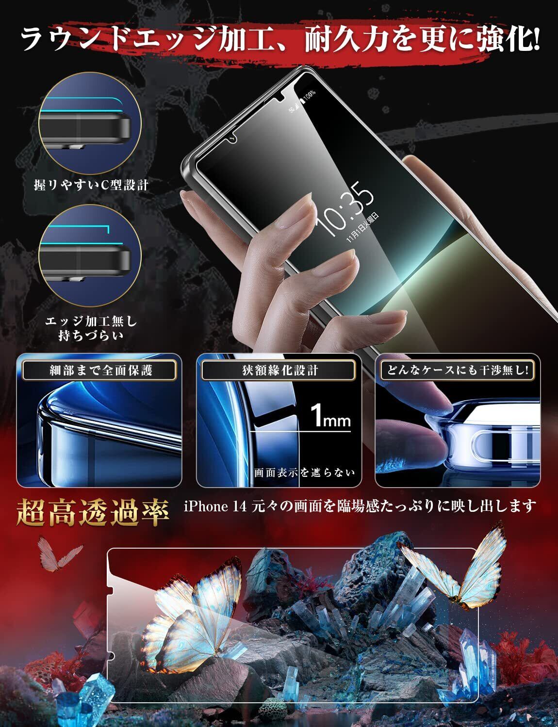 高透過率 〜 透過率99% │ 高品質の旭硝子を採用しており、光の透過率が99%で、透明度が普通のスマートフォン ガラスよりも高くて、元々の画質が損なわれません。高画質な写真や動画を楽しむことができます。