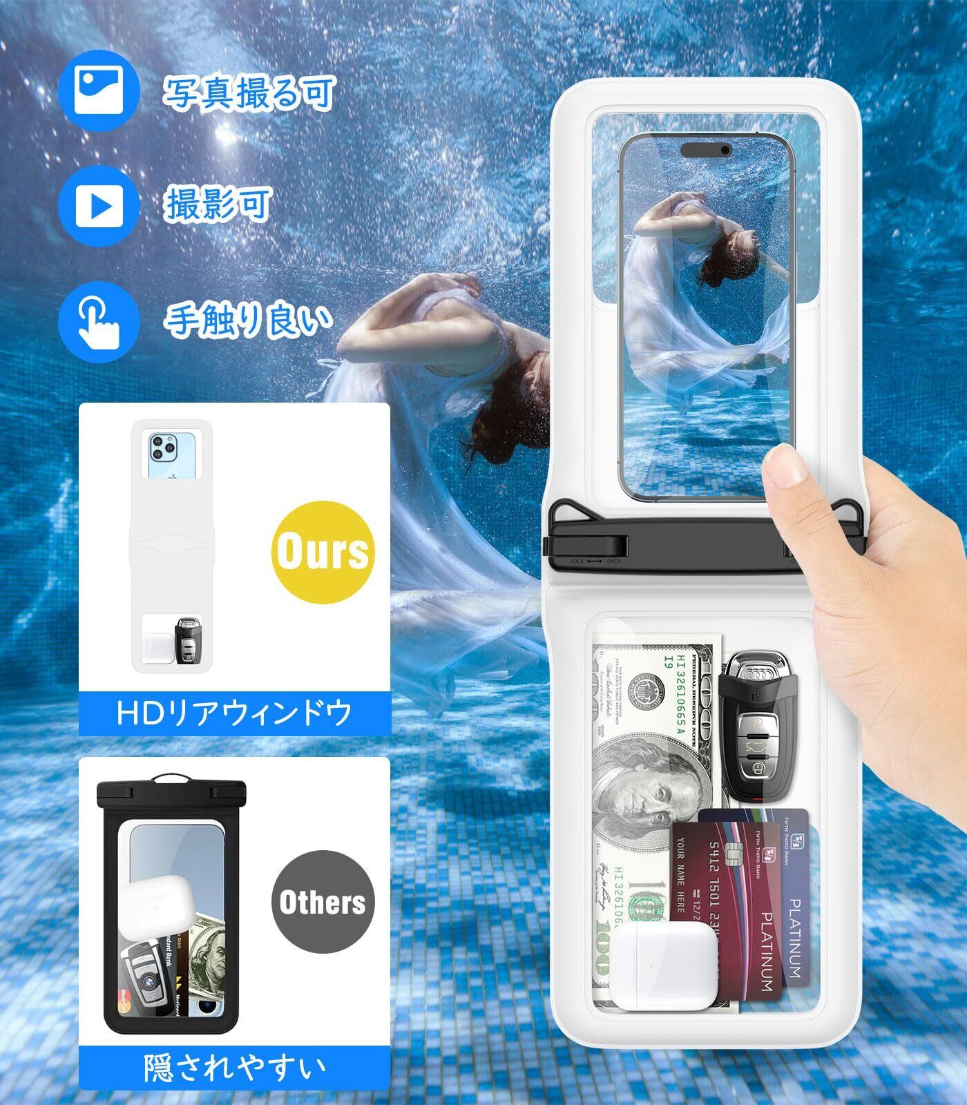 「ケースを装着したままでタッチ可能」カバー表面は透明ソフトなビニール製で、デバイス画面は鮮明に現せ、画像・動画撮影も問題なく行えます。カバー越しでの画面タッチもスムーズに行えます。指紋認証(ホームボタン)は認識されませんのでご了承ください。ご注意:水中ではタッチパネルは認識されませんので、水中で写真を撮る場合は音量ボタンをシャッターとして使ってください。