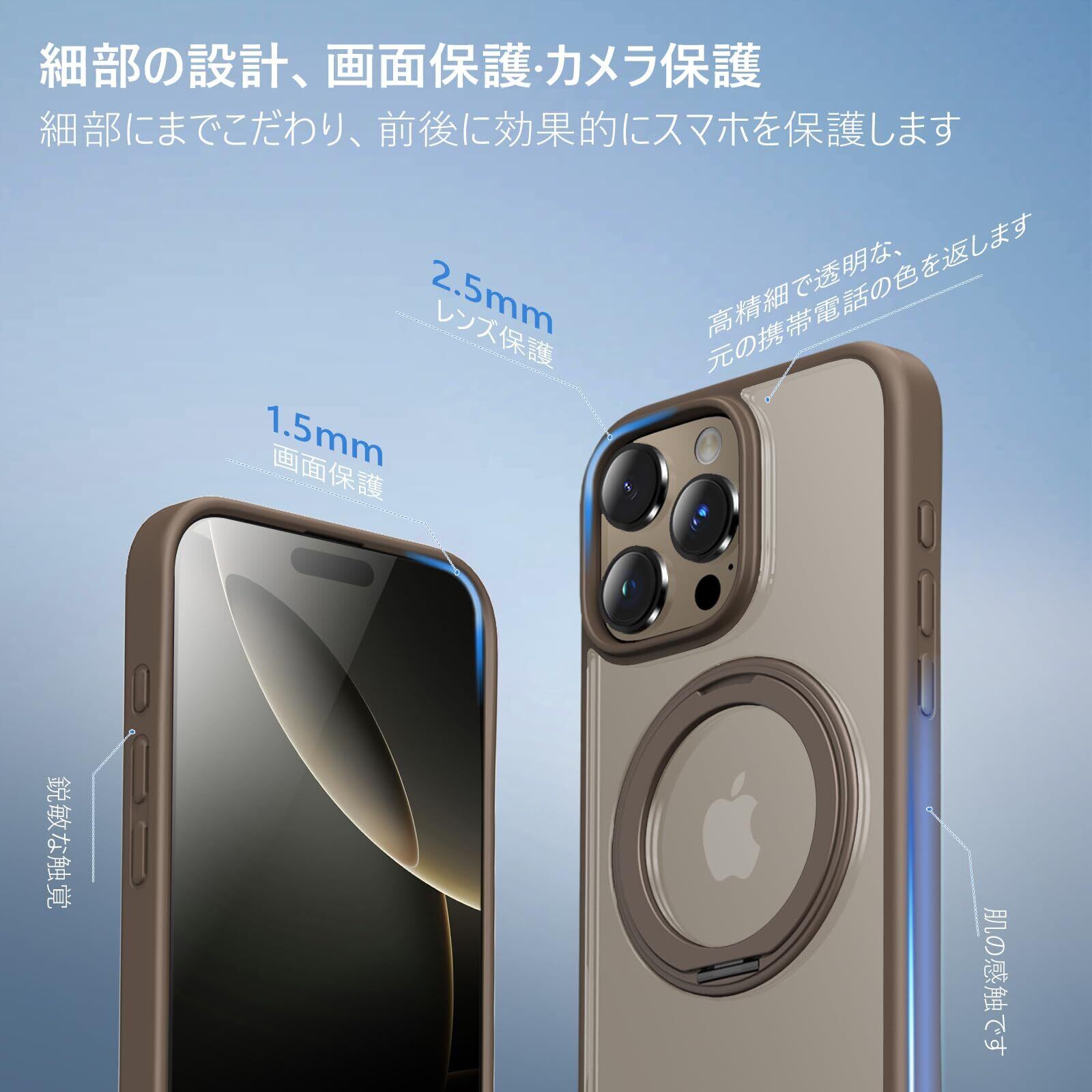 【縦横360度自由回転】アップグレードされた360度回転軸はよりスムーズに回転し、静かでスムーズな回転を実現します。ブラケットのマルチアングル回転により、使用機能が充実します。お好みに合わせて調整でき、スタンドはお好みの角度に機能を調整できます。縦持ちでも横持ちでも、スマートフォンをしっかりと支えられるスタンドです。自然な姿勢でYouTubeや映画、動画視聴、ビデオ通話などを楽しめます。 iPhone 16pro 用(6.3インチ)の保護ケースです。(iphone 16 pro ケース)