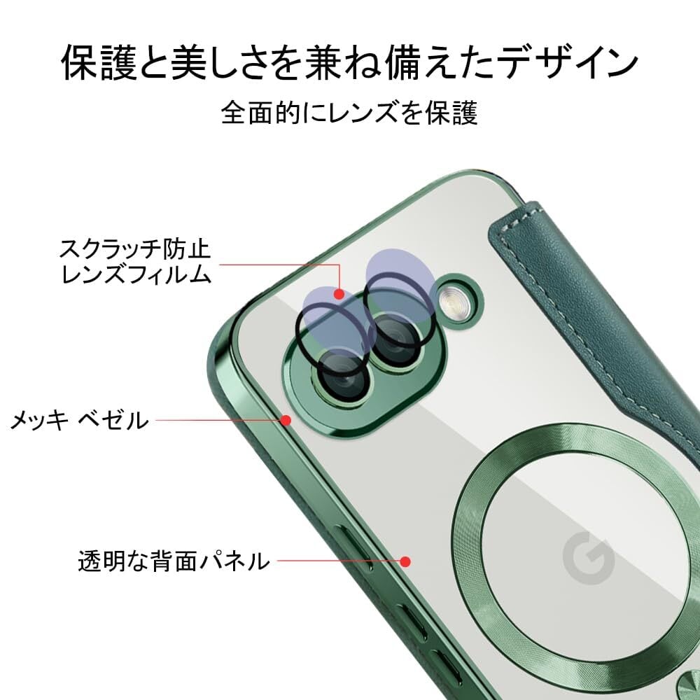 【新着商品】【REHOOF】google pixel9a 用 ケース 手帳型 magsafe対応 背面 透明 クリア 財布型 マグセーフ 手帳 カード収納 ワイヤレス充電対応 カード入れ PU革 レザー Pixel 9a スマホケース おしゃれ 軽量 薄型 防塵 耐衝撃 全面保護 スマホカバー(グリーン) | impsmile