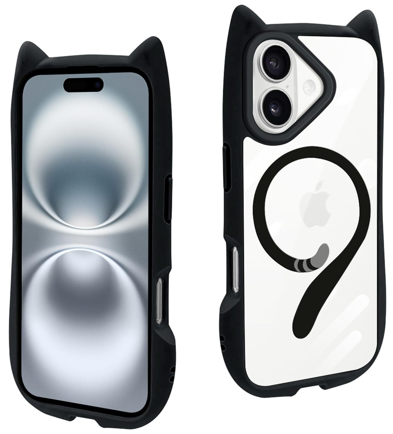 iPhone 16 ケース 専用 猫耳 mimi MagSafe対応 TPU ストラップホール付き ねこみみ 猫 ネコ ねこ 背面クリア シンプル おしゃれ アイフォン 16 カバー かわいい 指紋防止 耐衝撃 韓国 スマホケース(クリアブラック)
