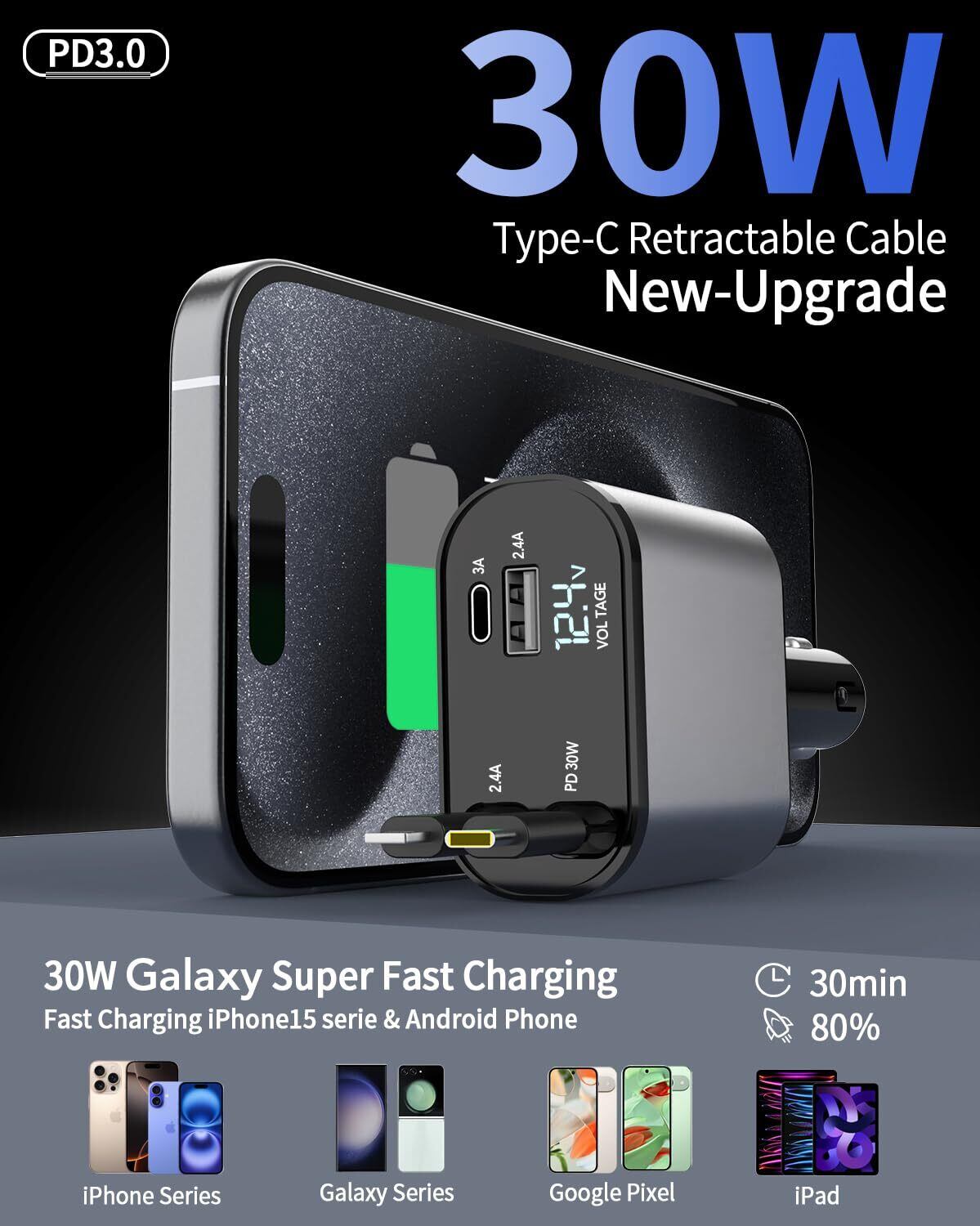 【4台同時に充電】新版 シガーソケット 2 USBポート+2 巻取り式ケーブル、4台のデバイスを同時に充電でき。出張、自走、家族、グループ、団体旅行など、さまざまなシーンで活用できます。iPhone 16/15/14/13/12/11/Plus/Pro/Pro Max/mini/XS/XS Max/XR/X/8 Plus/8/7Plus/7/6s/6です。Galaxy S25 | S25+ Galaxy S25 Ultra/Galaxy Z Fold6/GalaxyZ Flip6/Galaxy Buds3/Galaxy Note 20 Ultra/ Note10 Plus/S23/S22/S22 Ultra/S21+/S20/S10 5G/A54/S/S9 Plus/S8+/Note 9,google Pixel7/7a/6/6a/5/4xl/3xl/2xl/3xl/4a/4/4a/Nexus6pなどです。