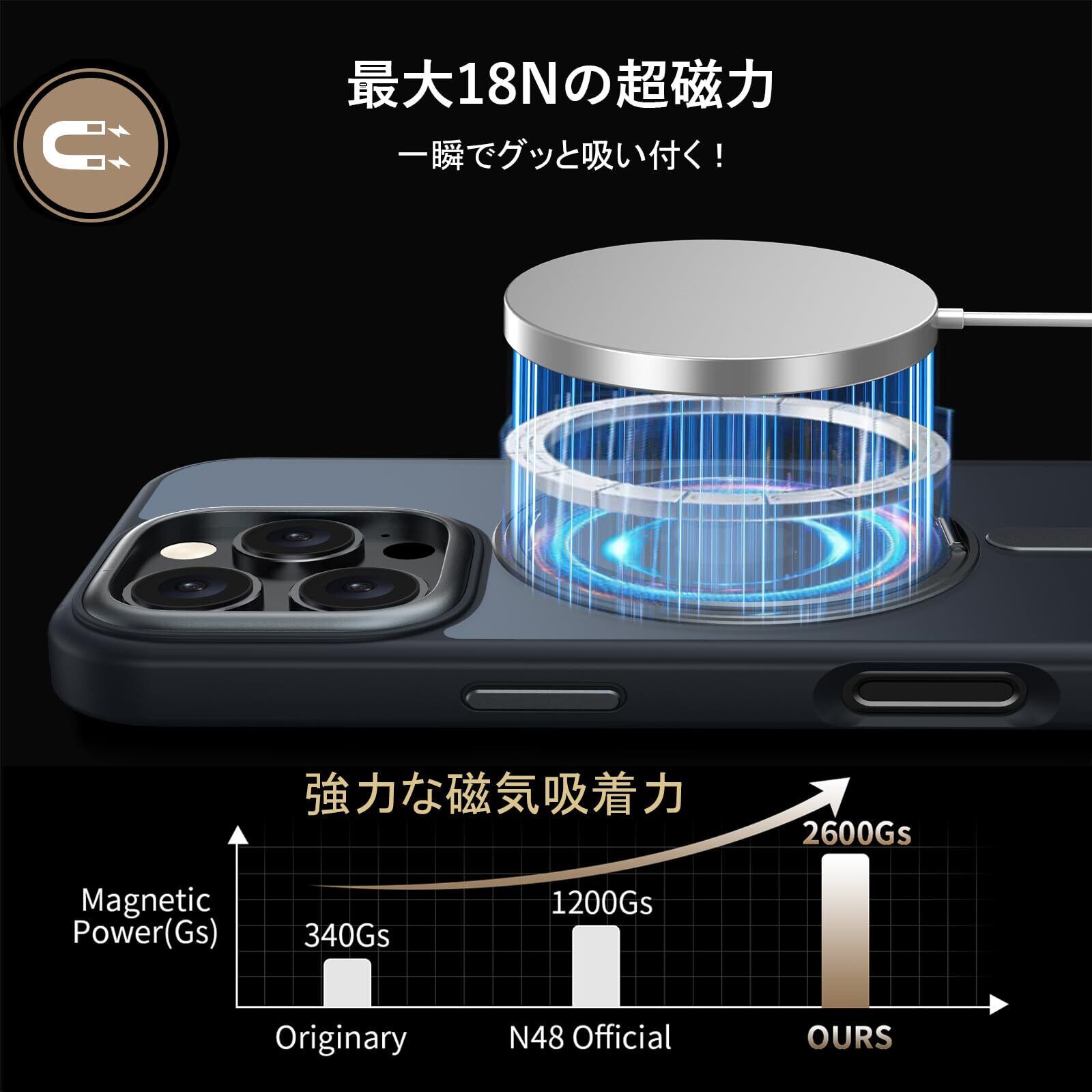 「Magsafe対応」ケースをつけたままマグセーフ機能を快適に使用できます。背面に薄くて強いマグネット内蔵しています、ワイヤレス充電や車載ホルダーやアクセサリとのあらゆる充電に安定で接着ができ、差し込みのいらないより簡単により素早く充電できます。