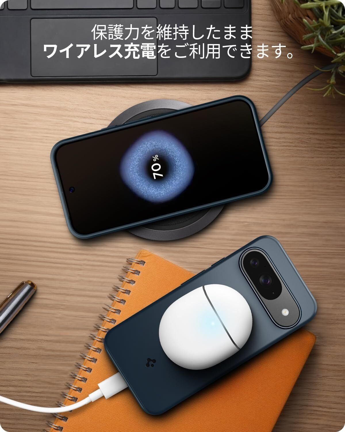 【ワイヤレス充電対応】程よい厚さでケースを装着したまま「ワイヤレス充電」が行えます。