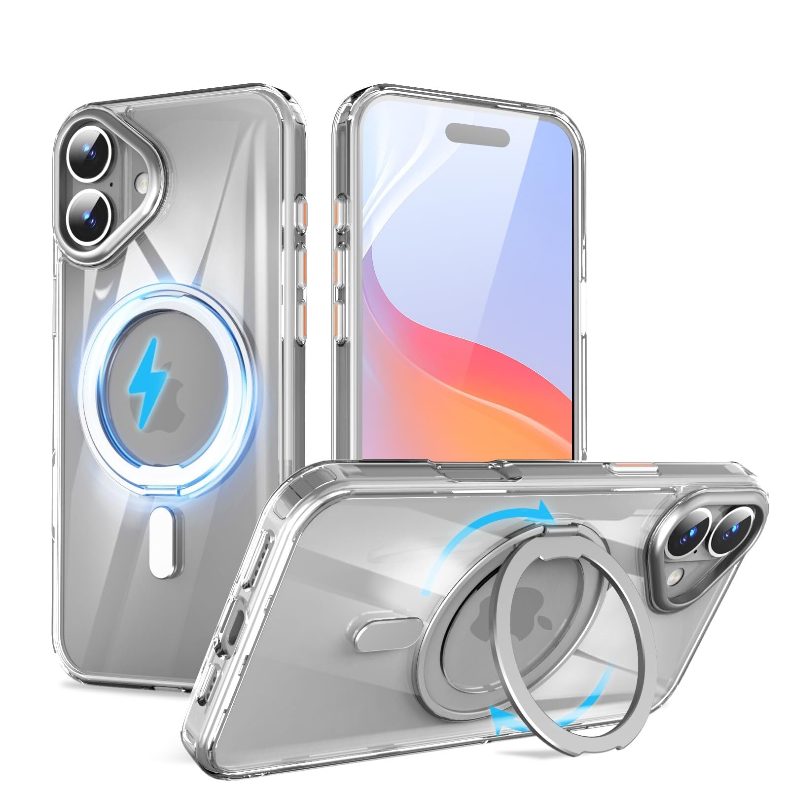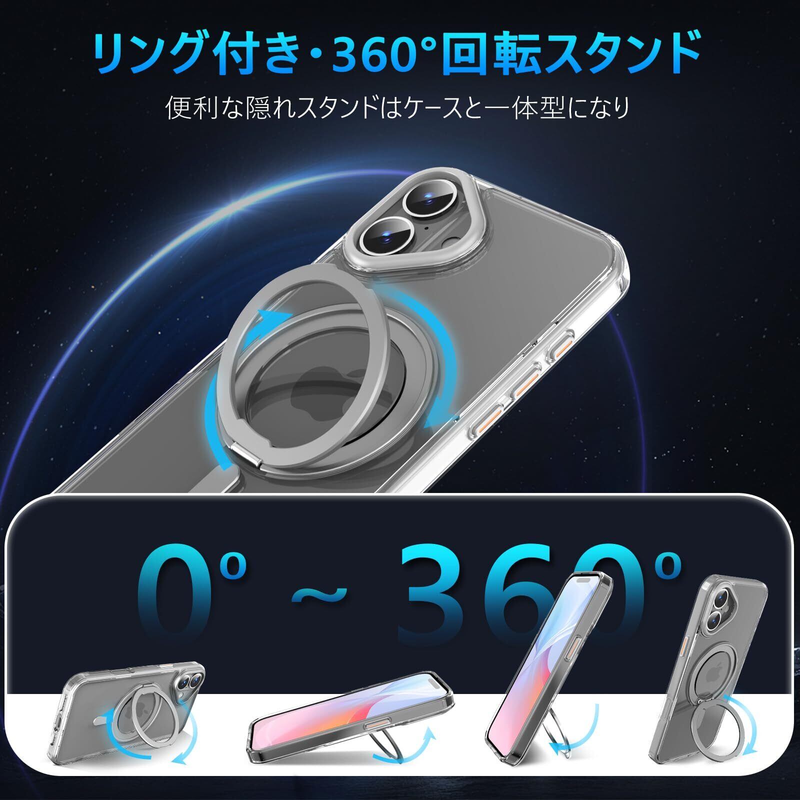 QUEASON 互換品 スマホケース【iPhone 16Plus 用 MagSafe対応 ケース】360°回転スタンド ワイヤレス充電対応 いphone16plus 用 ケース リング付き 米軍MIL規格 iphone 16 plus 用 ケース 超強磁力 落下防止 iphone16plus 用 ケース 耐衝撃 iphone16プラス 用 ケース 半透明 防指紋(クリア)
