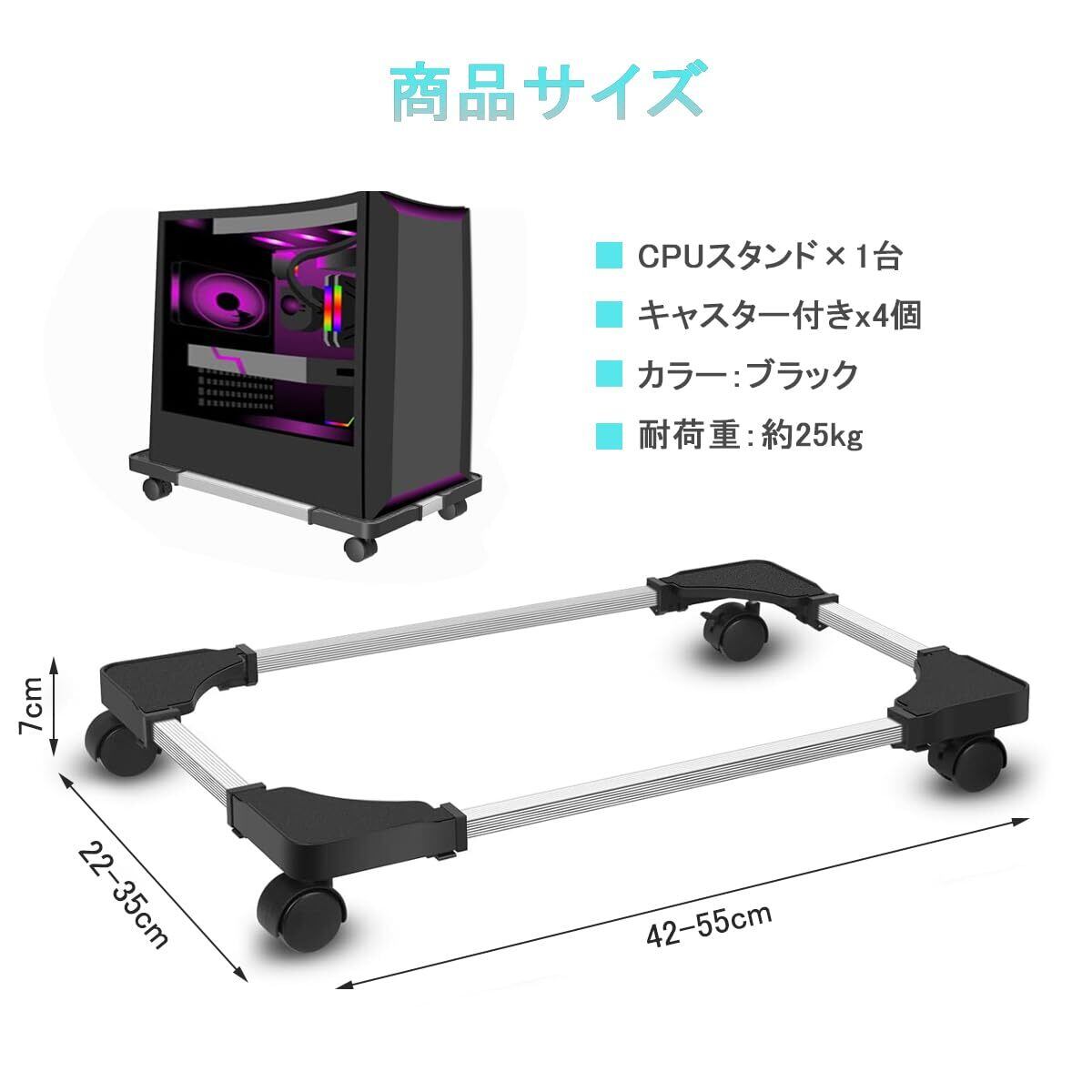 ⇝【セット内容】CPUスタンド×1台、キャスター付きx4個、サイズ:横幅約42cm~55cm、縦幅約22cm~35cm;カラー:ブラック;耐荷重:約25kg。