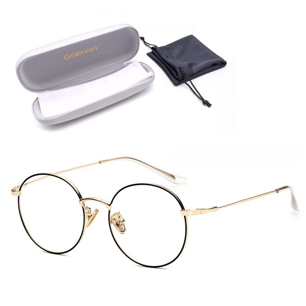 [Granvan] ブルーライトカット メガネ pcメガネ uvカット おしゃれ スマホ用 丸メガネ 伊達メガネ 超軽量 度なし レディース メンズ ユニセックス ケース付き (01 ゴールドー黒縁)