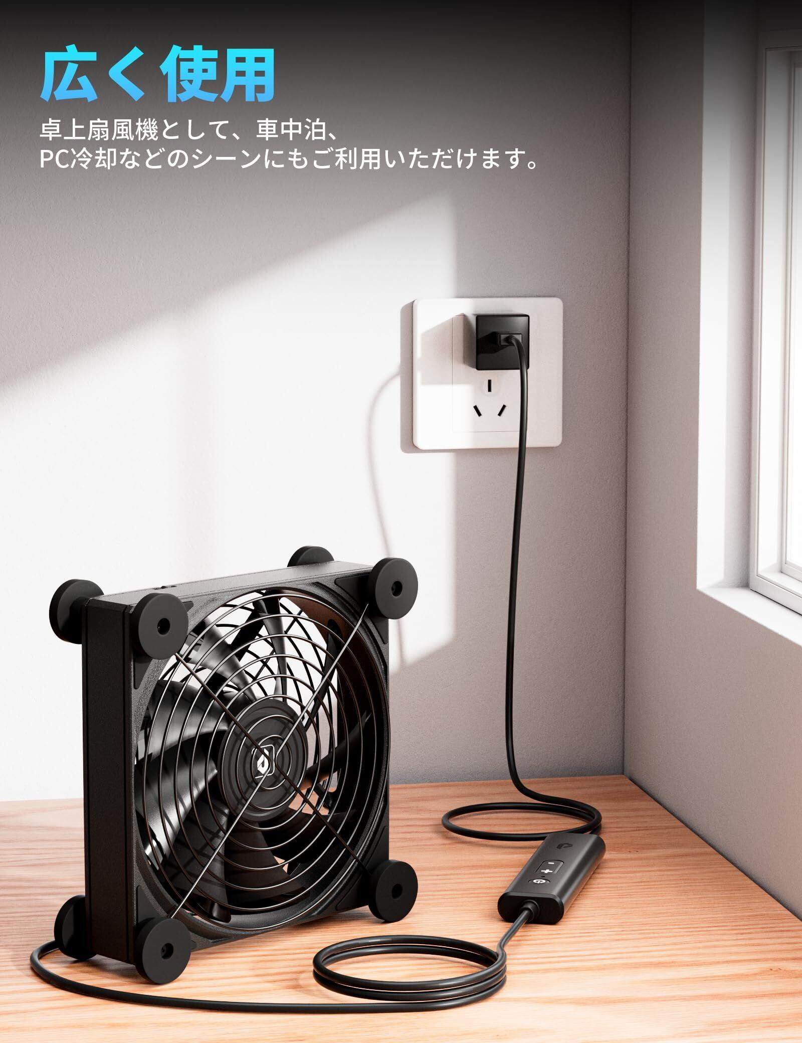 多用途排気扇:空冷ファン、扇風機、換気や機器の冷却、外付けHDDやルーター、AV機器やスマート端末、PS4ゲーム機などの電子機器を冷やすために設計されており、熱暴走などによる故障や負荷を防ぎます、ミニPCの冷却に最適。狭い場所でもご利用いただけます。卓上扇風機としても、水槽、車中泊などの屋外活動時には排気や換気のためにご利用いただけ、様々なシーンで活躍します。