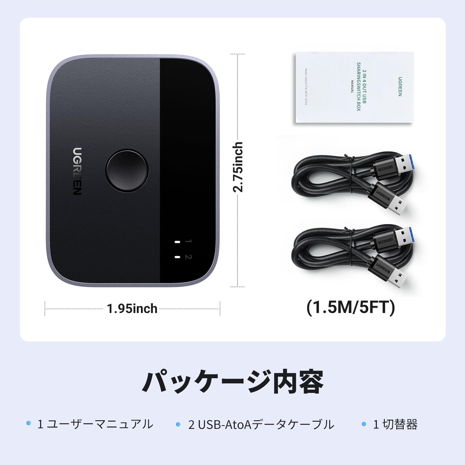 【注意事項】:※重要!!これはKVMスイッチではなく、モニターをサポートしません。USB 出力ポートはデータ転送のみをサポートし、ビデオ転送はサポートしません: 1x 2ポートUSB3.0切替器、2 x 1.5m USB 3.0 A to Aケーブル、1*ユーザーマニュアル。