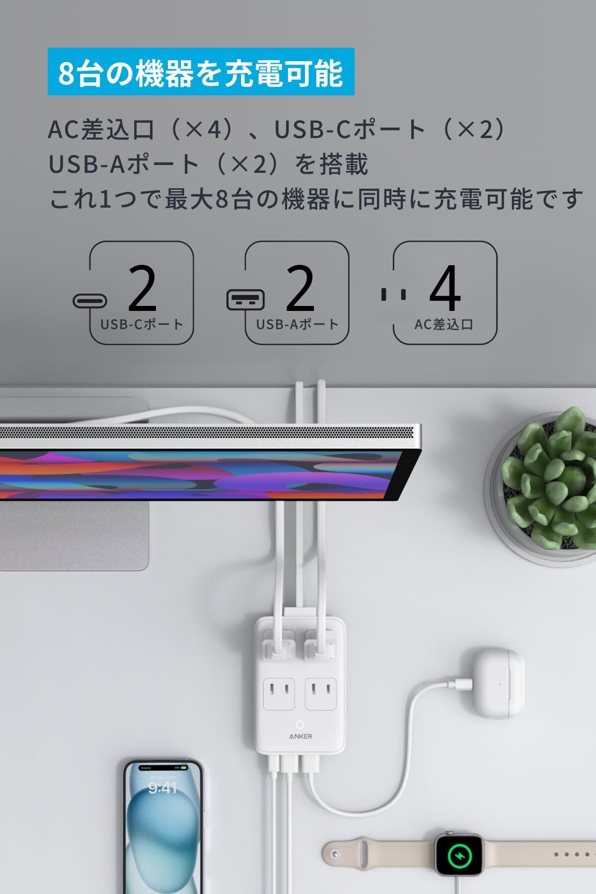 8台の機器を充電可能:AC差込口(×4)、USB-Cポート(×2)、USB-Aポート(×2)を搭載。これ1つで最大8台の機器に同時に充電可能です。
