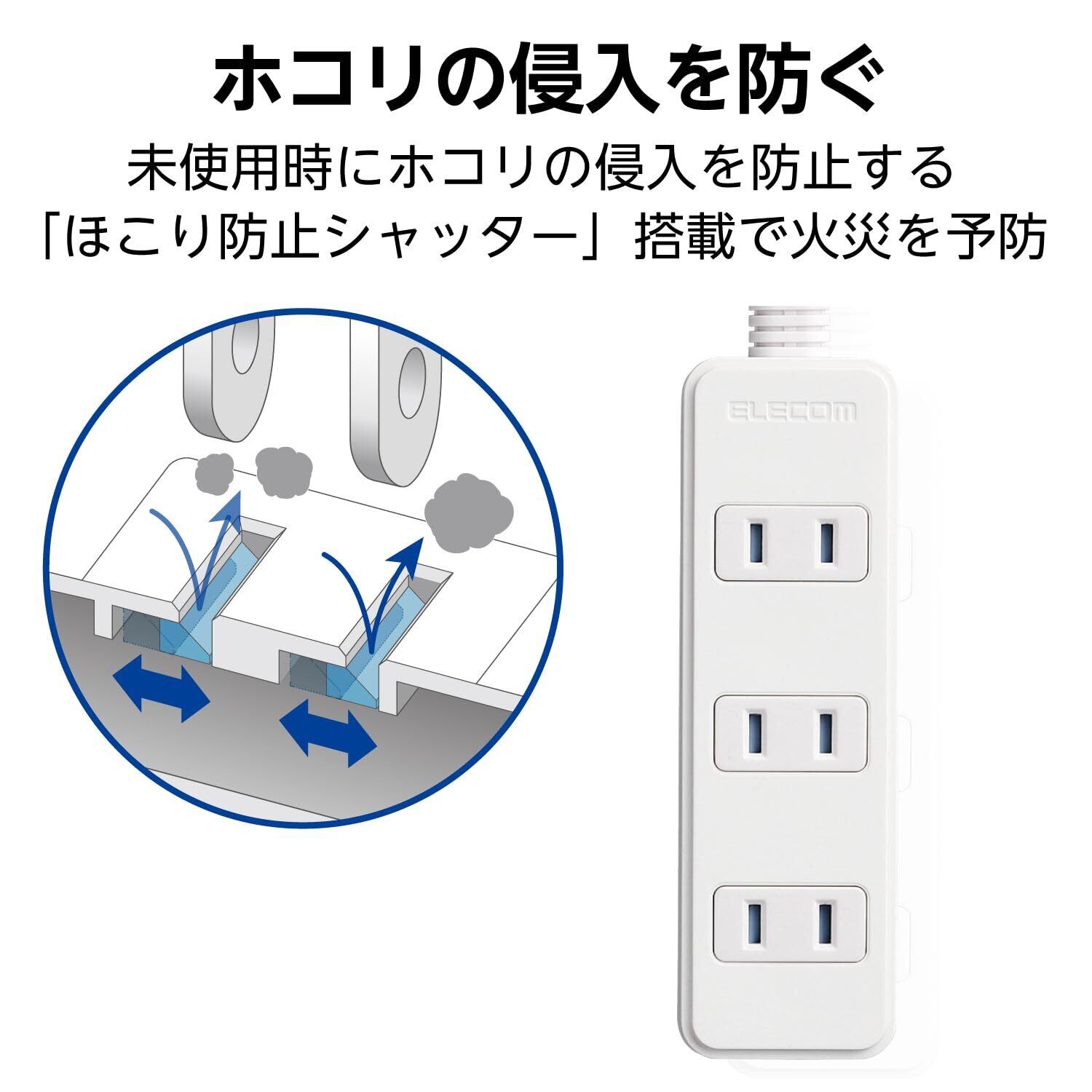 未使用時にほこりの侵入を防止する「ほこり防止シャッター」を装備した電源タップです。