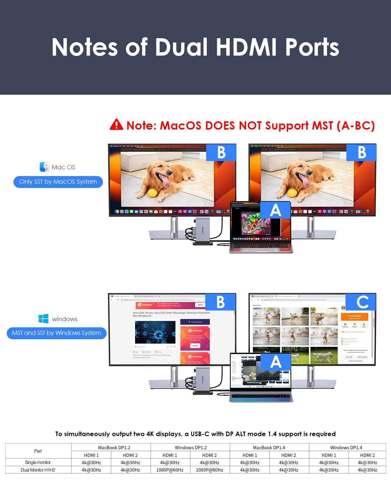 ご注意:MacOSシステムではミラー(SST)モード(外部モニターの同一画面)のみがサポートされており、拡張モード(MST)はサポートされていません。USB3.0(USB-Cタイプ)はデータ伝送しかできず、ビデオ出力は不可です