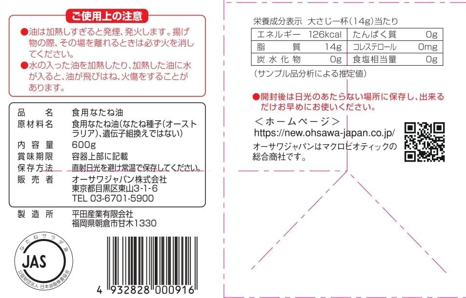 開封後は日光のあたらない場所に保存し、出来るだけお早めにお使いください。油は加熱しすぎるとと発煙、発火します。揚げ物の際、その場を離れるときは必ず火を消してください。水の入った油を加熱したり、加熱した油に水が入ると、油が飛びはね、火傷をする恐れがあります。