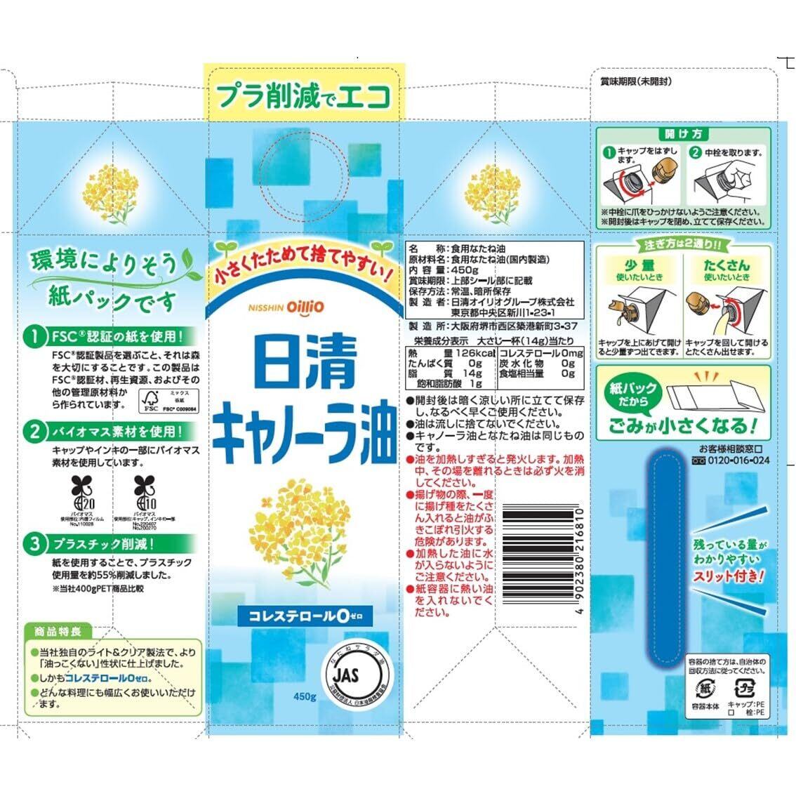 日清オイリオ 日清キャノーラ油450g紙パック×3