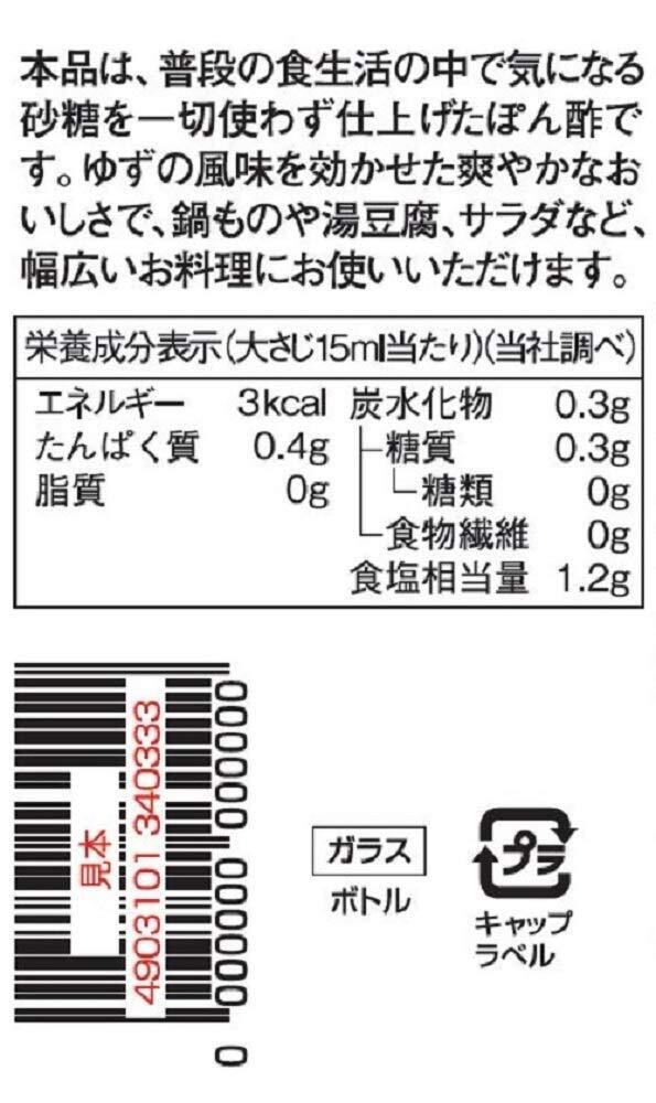 原材料:しょうゆ(小麦・大豆を含む、国内製造)、食塩、たん白加水分解物(大豆を含む)、ゆず果汁、こんぶエキス、醸造酢/調味料(アミノ酸等)、酸味料、カラメル色素、香料、甘味料(スクラロース、アセスルファムK)