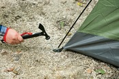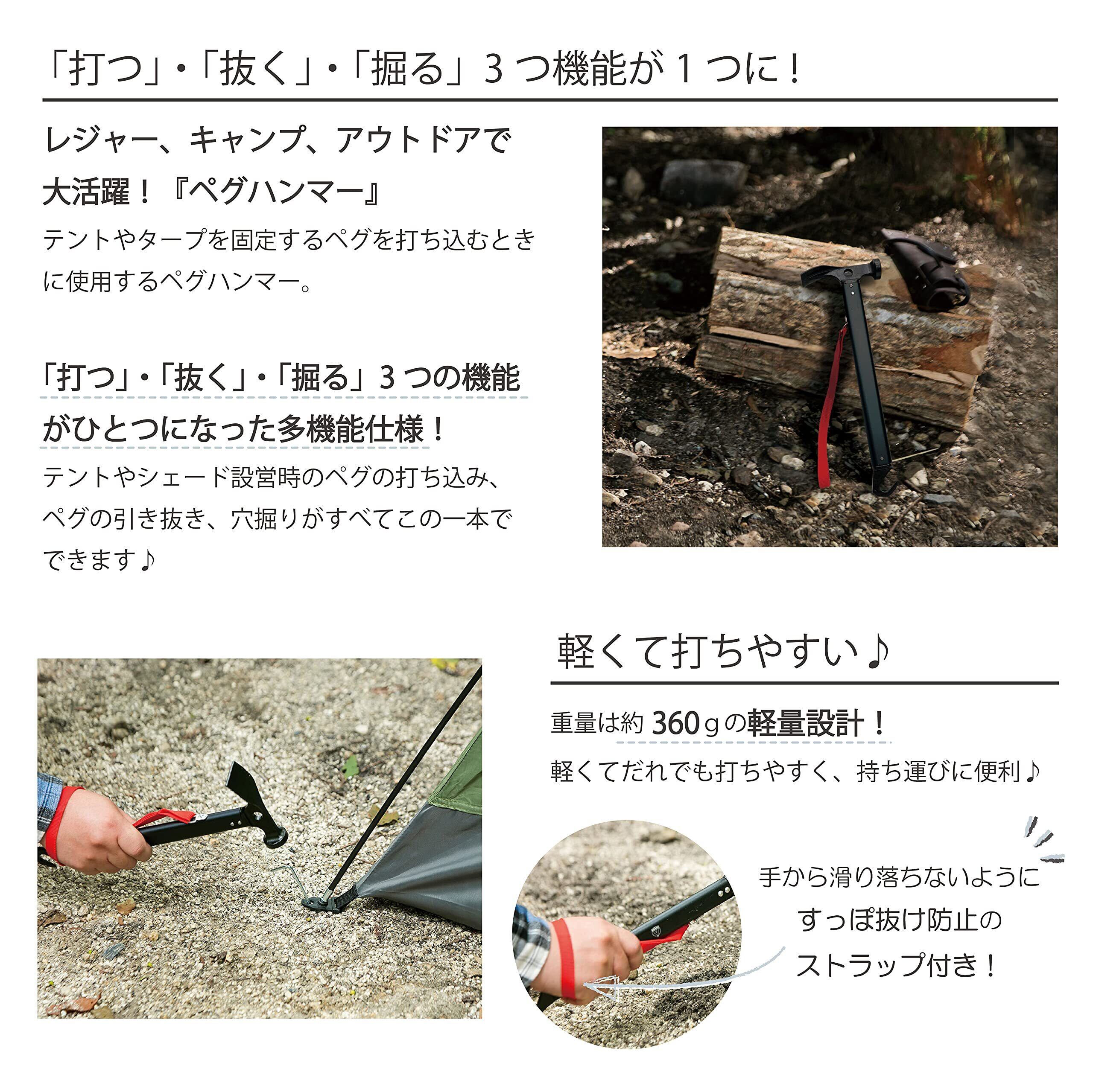 テントやタープを固定するペグを打ち込むときに使用するペグハンマーです。「打つ」・「抜く」・「掘る」3つの機能がひとつになった多機能仕様テントやシェード設営時のペグの打ち込み、ペグの引き抜き、穴掘りが全てこの一本でできます。 軽くて打ちやすい ・重量は約360gの軽量設計。 ・手から滑り落ちないように、すっぽ抜け防止のストラップ付き。 ペグの引き抜きが簡単 ・フック状になった柄の下部でペグ抜きが可能。 ・さらにヘッド中心部に穴が空いており、ペグを引っ掛けて抜くのに便利。 土を簡単に掘れる ・ヘッド部分はクワ状になっており、土を掘り起こすことができる。