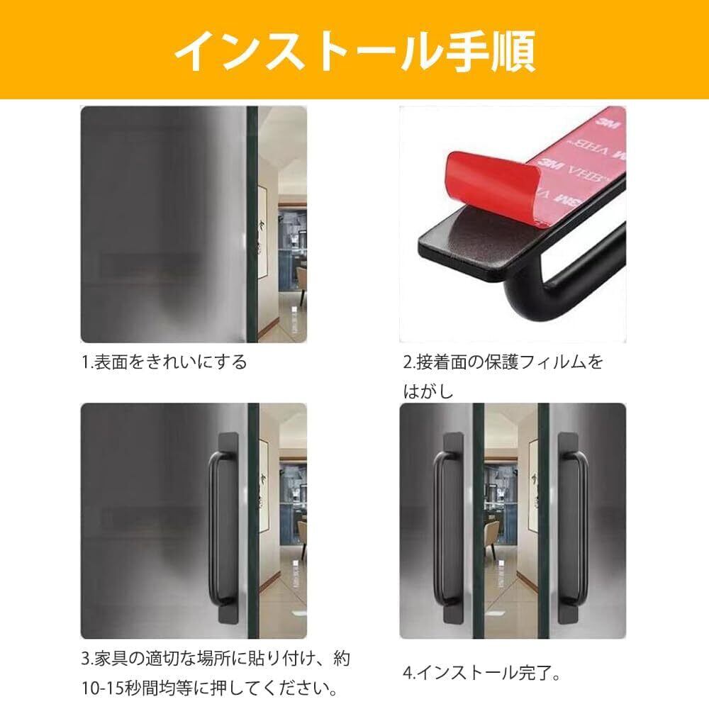 【取り付けが簡単】ドアハンドルの裏面には接着剤が付いており、保護フィルムを剥がして家具の適切な場所に貼り付け、約10秒間均等に押し付けるだけで取り付けが完了します。