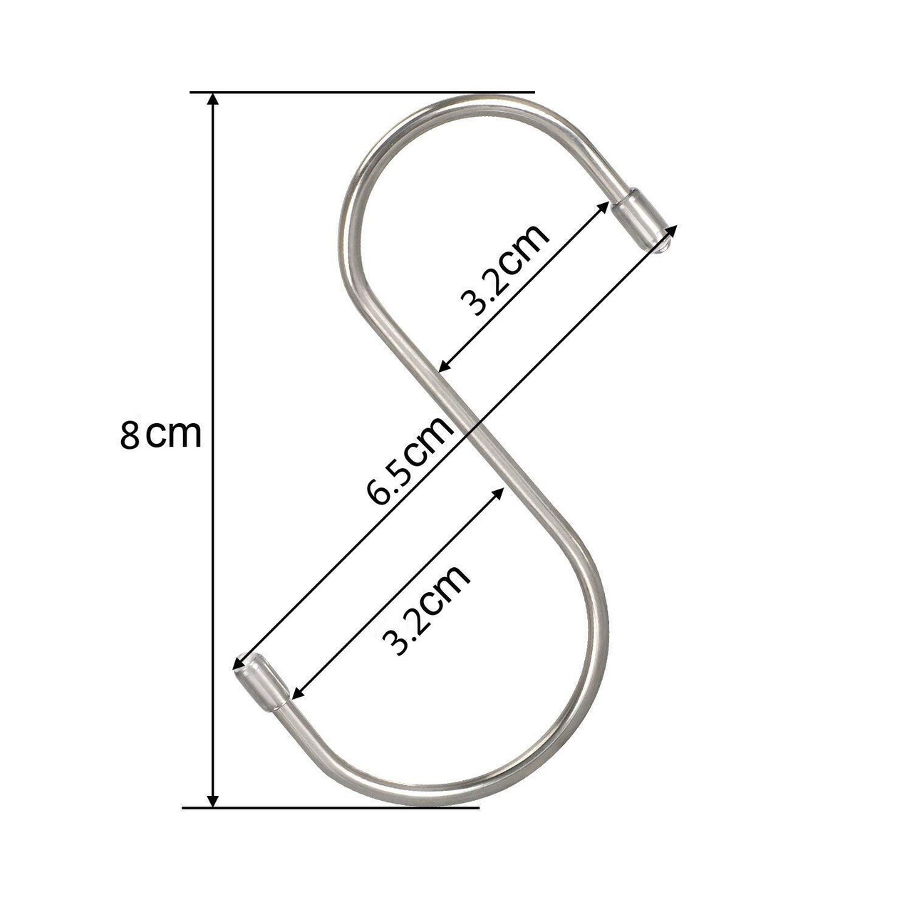S字フックサイズ:長さ約8cm、幅約3.2cm、厚さ約0.3cm。