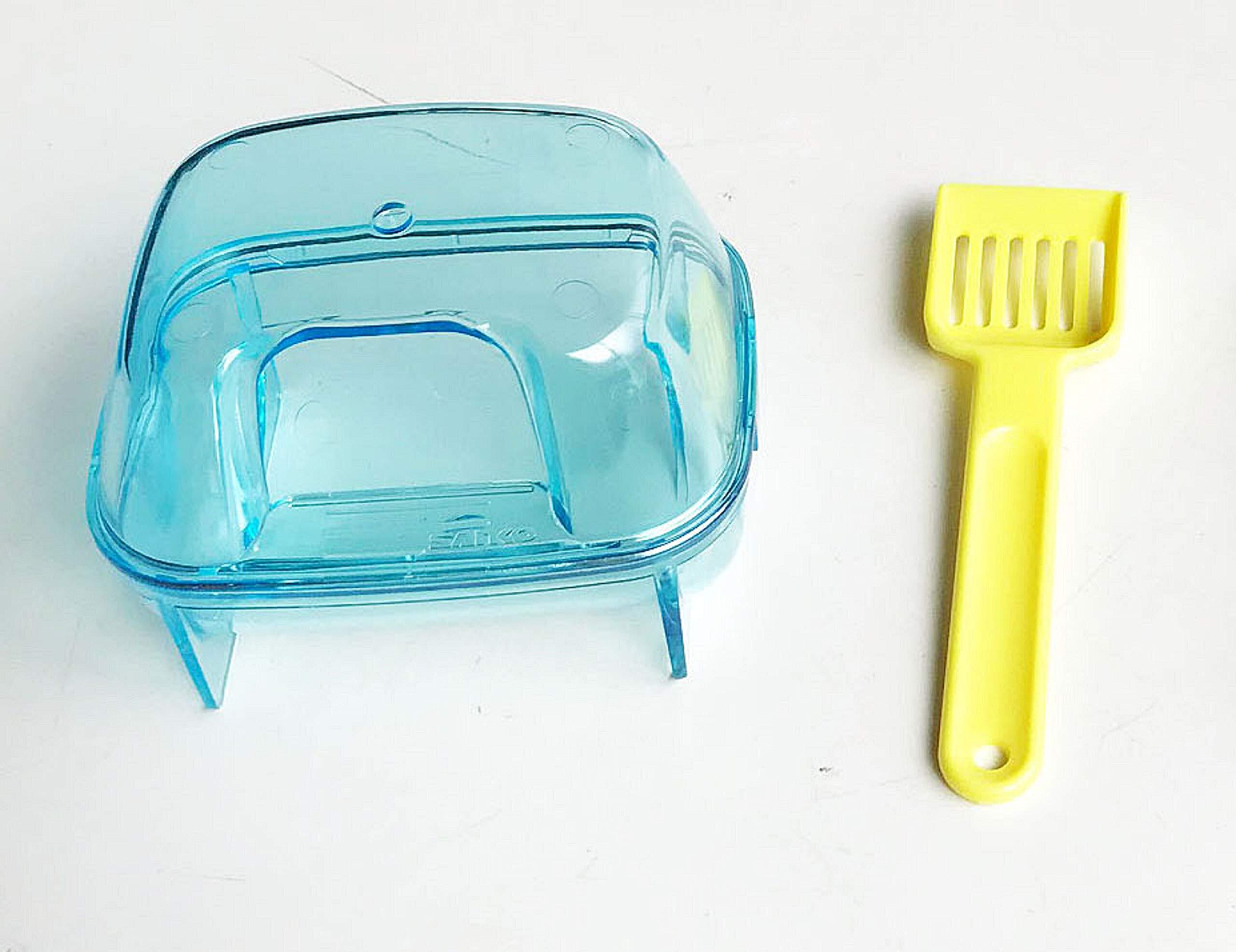 ほどよい囲いがホッと落ち着く。少ない砂でも充分に使えて砂かきをしても飛び散りにくい、ドワーフハムスターのトイレスペース。