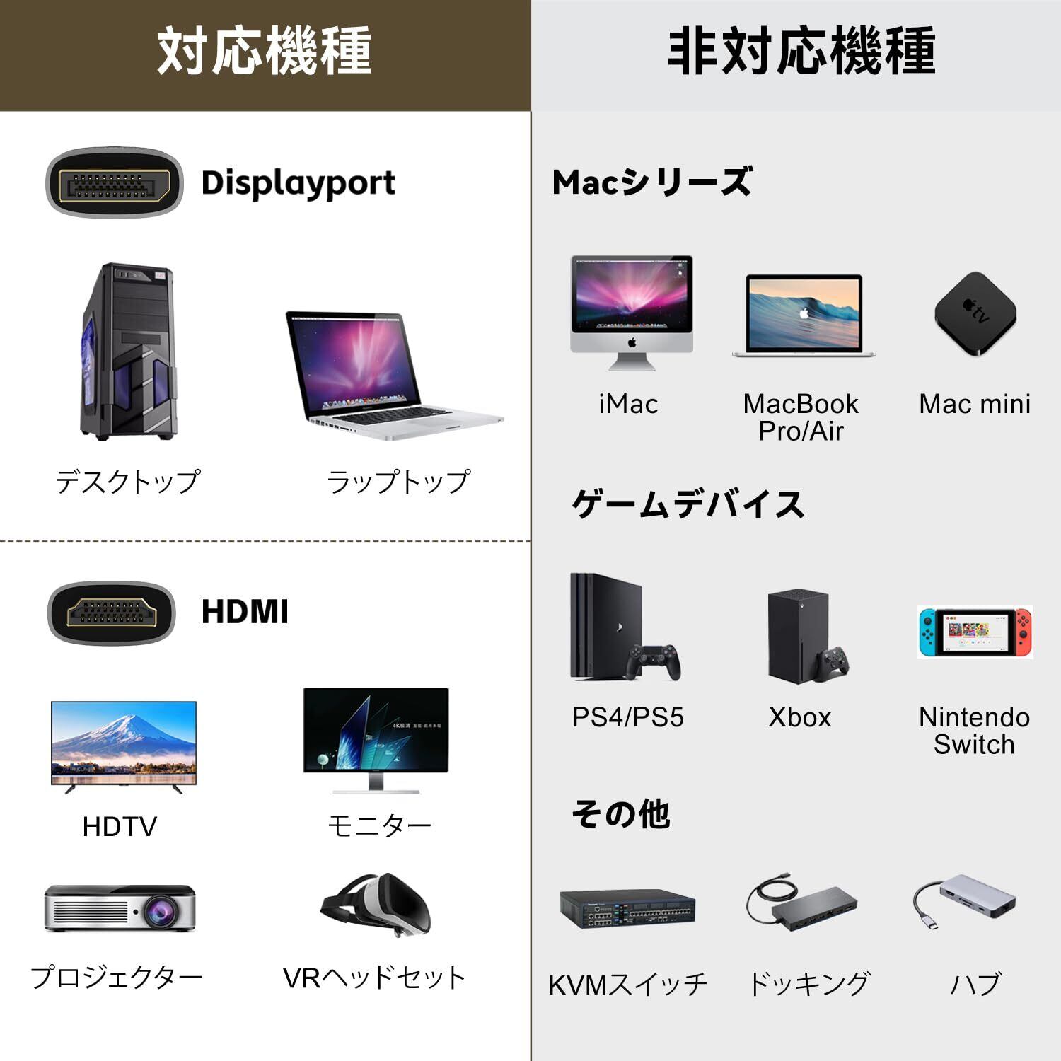 【単方向伝送】DPプラグは、PCホスト、グラフィックカードなど、DPポートを含むデバイスに接続することができます。そしてHDMIプラグは、HDMIポートを含むそれらのモニタに接続するために使用することができます。しかし、このケーブルは、HDMIソースデバイスからDPモニターへの変換をサポートしていませんので、PS4/PS5、Switchおよび他のHDMIソースデバイスに適用することはできません。