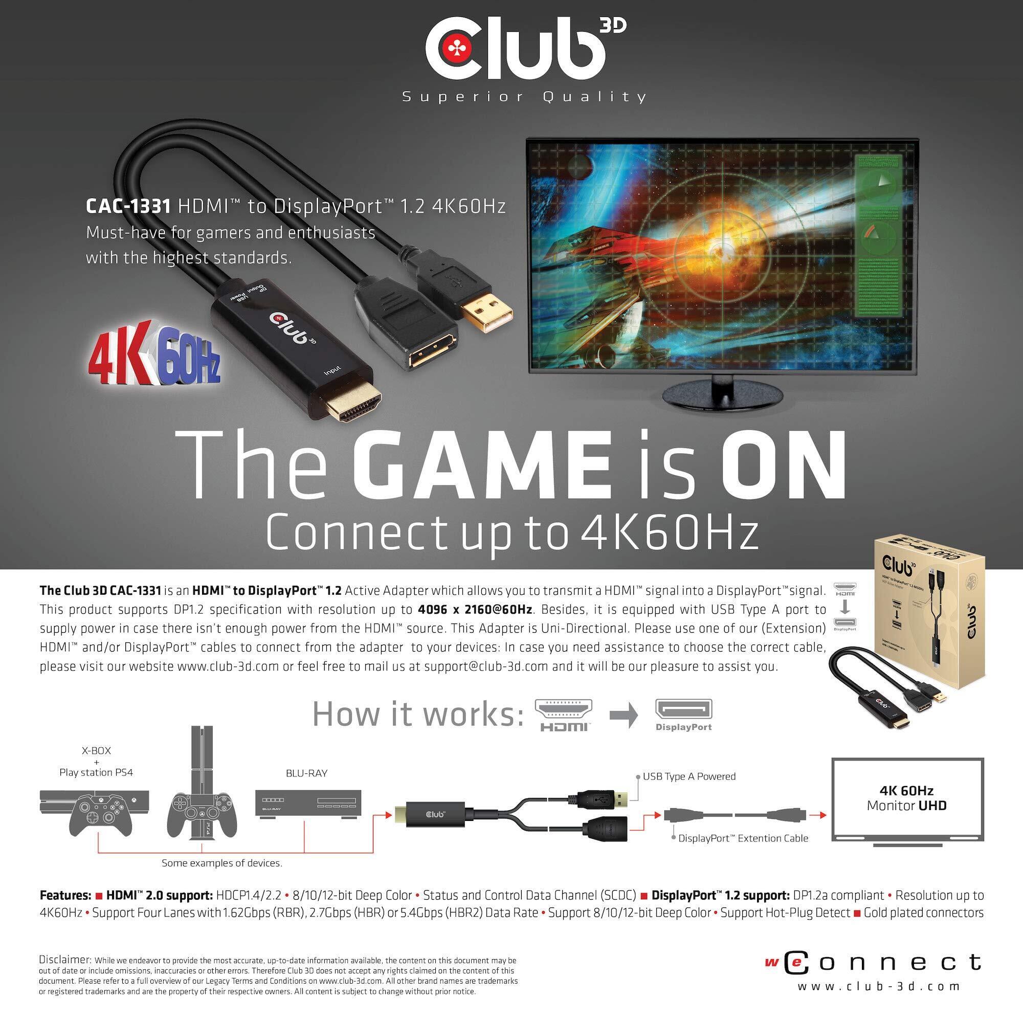 Club3D HDMI Male オス to DisplayPort 1.2 Female メス アクティブ アダプタ USB給電付き 4K@60Hz (CAC-1331)